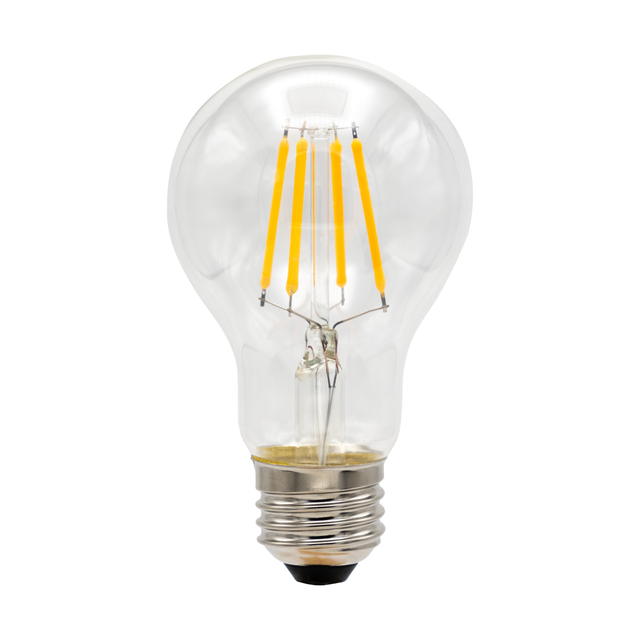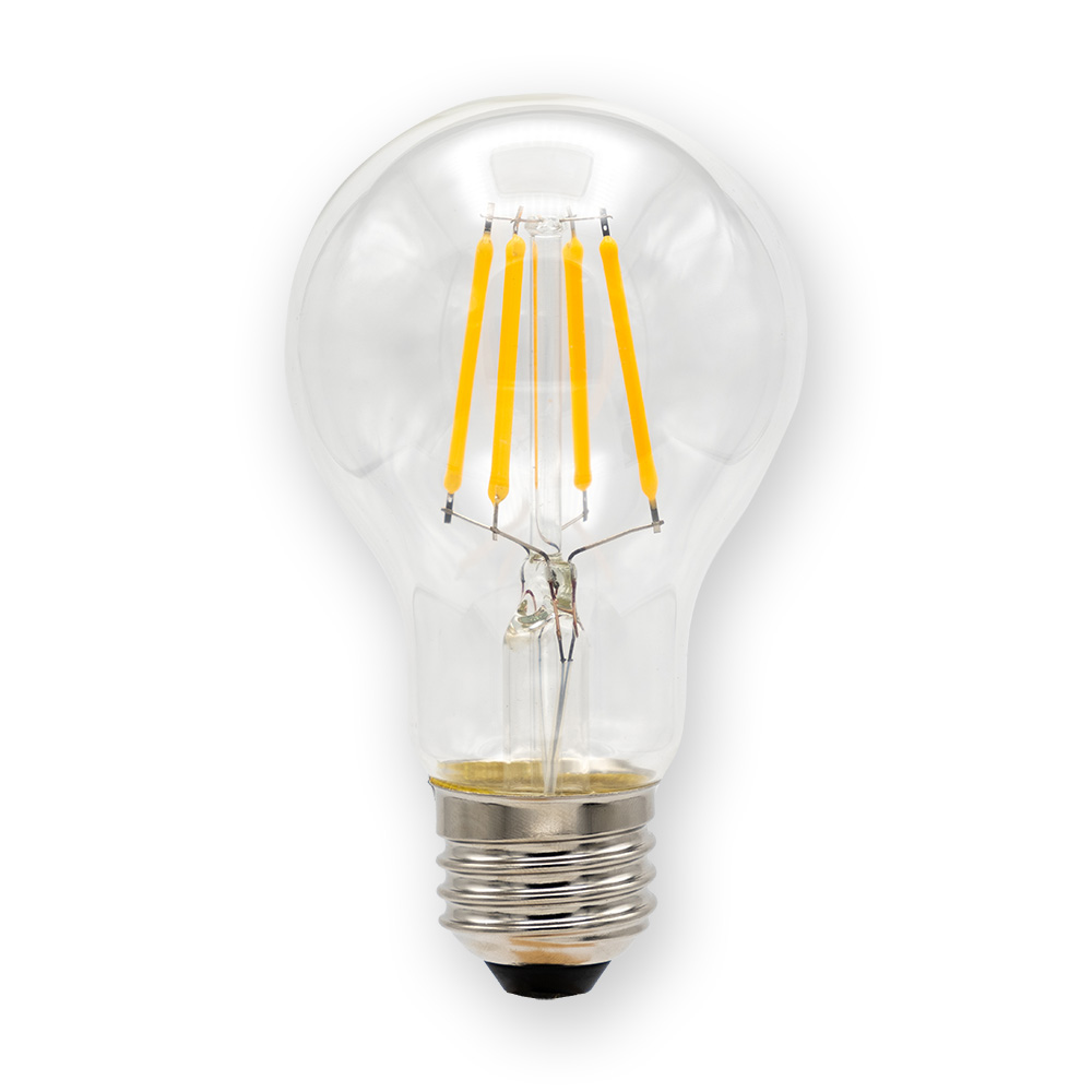 Ampoule à filament de remplacement dimmable, format A19, culot E26, avec lentille transparente, tension d’entrée 120 V CA. 5 W / 500 lumens, IRC > 90, température de couleur 3 000 K.