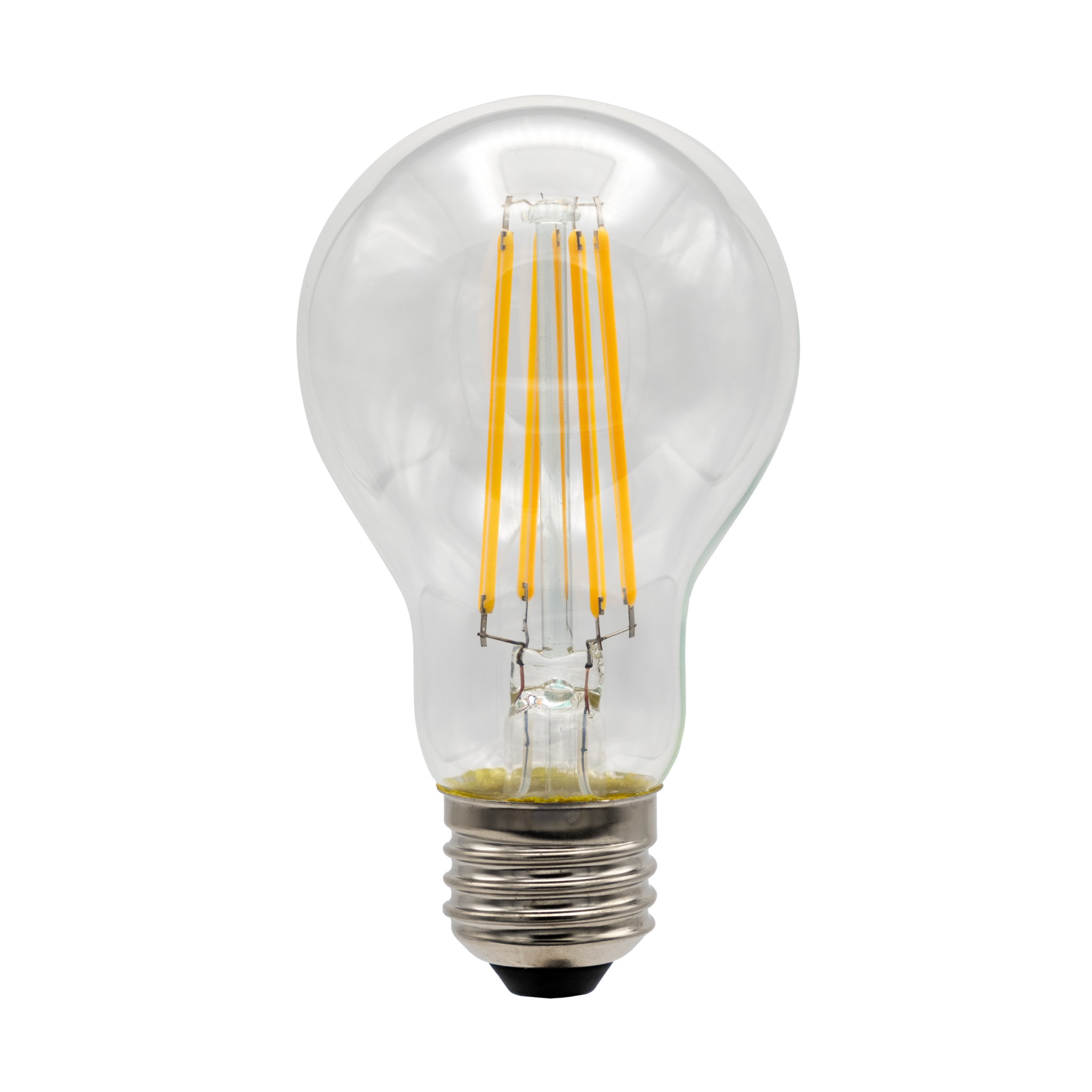 Ampoule à filament de remplacement dimmable, format A19, culot E26, avec lentille transparente, tension d’entrée 120 V CA. 7 W / 800 lumens, IRC > 90, température de couleur 3 000 K.