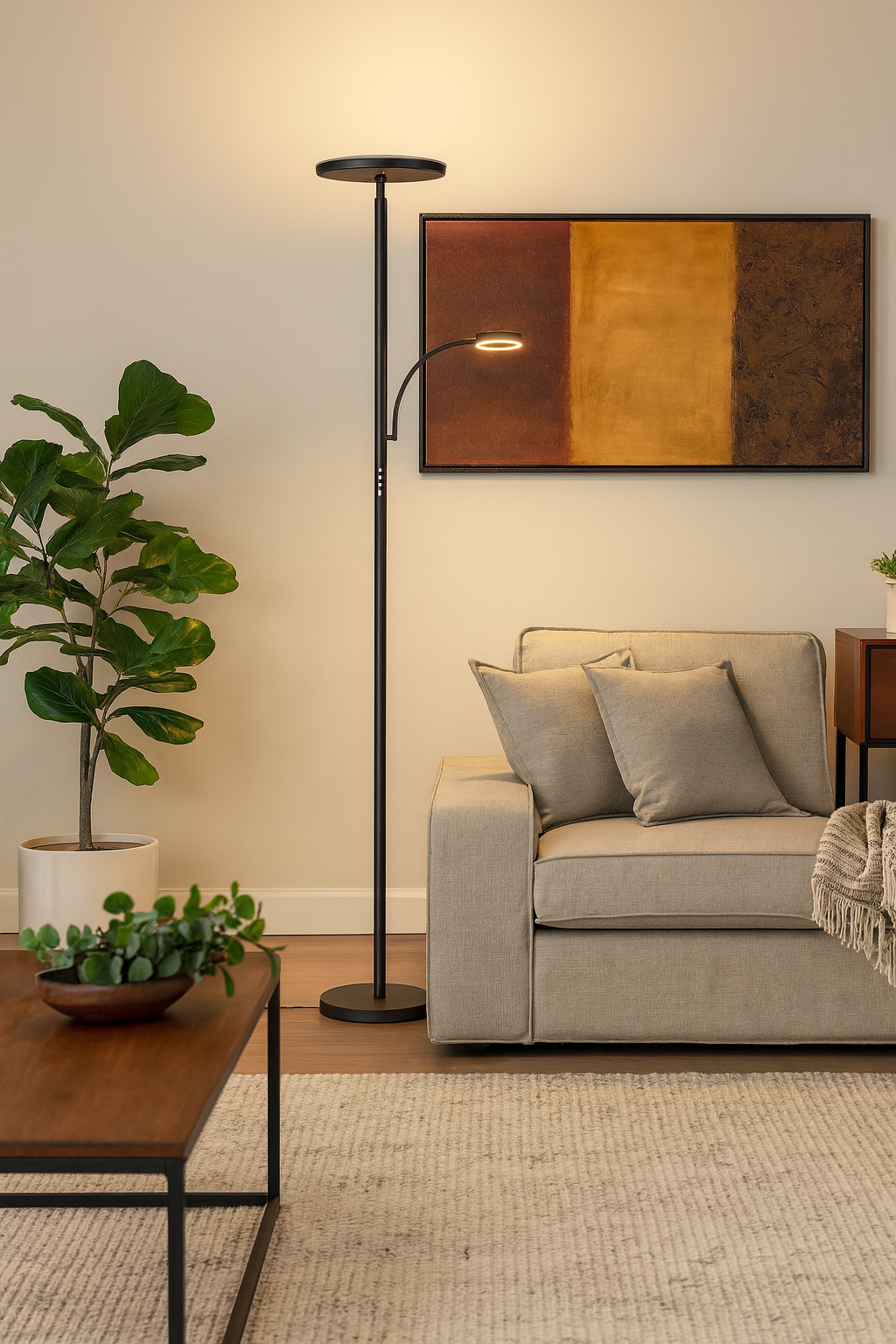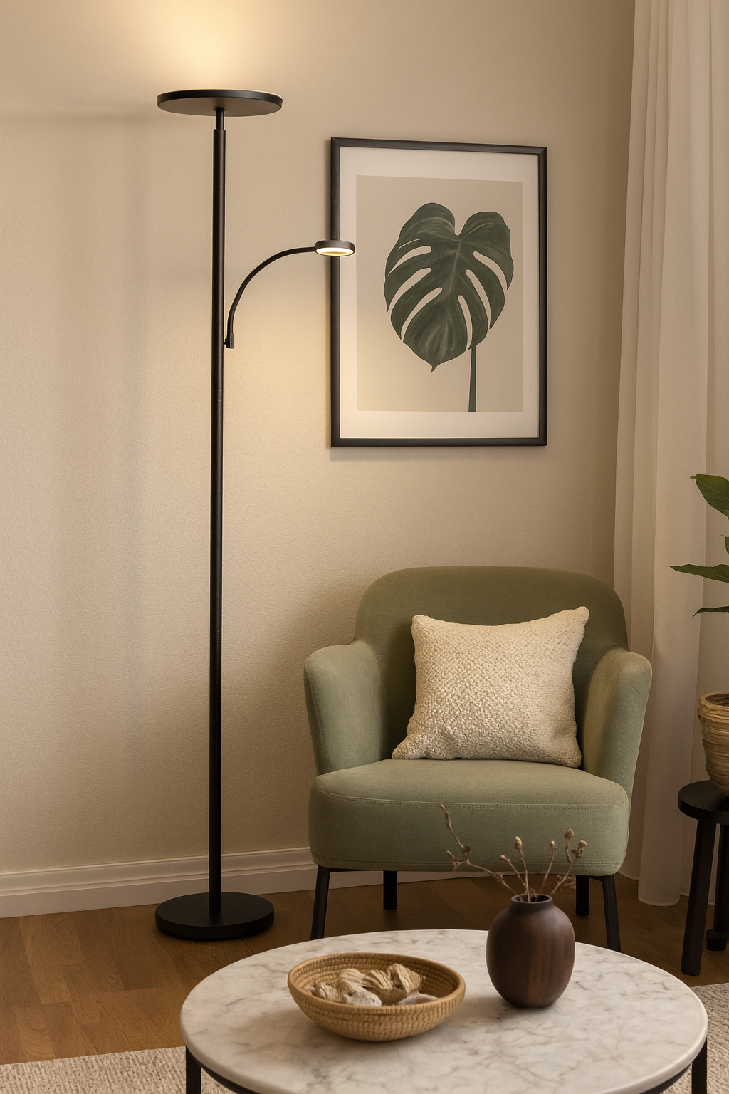 Alliez style, performance et polyvalence avec cette lampe torchère moderne au DEL. Offerte en noir mat ou blanc, elle propose un design épuré qui s’intègre parfaitement à tout décor contemporain. La tête principale diffuse une lumière directe vers le plafond pour un éclairage d’ambiance doux et uniforme, tandis que le bras de lecture flexible offre un faisceau directionnel idéal pour la lecture ou les travaux de précision. Grâce à son gradateur tactile intégré, vous pouvez ajuster l’intensité lumineuse selon vos besoins et créer l’ambiance parfaite.
