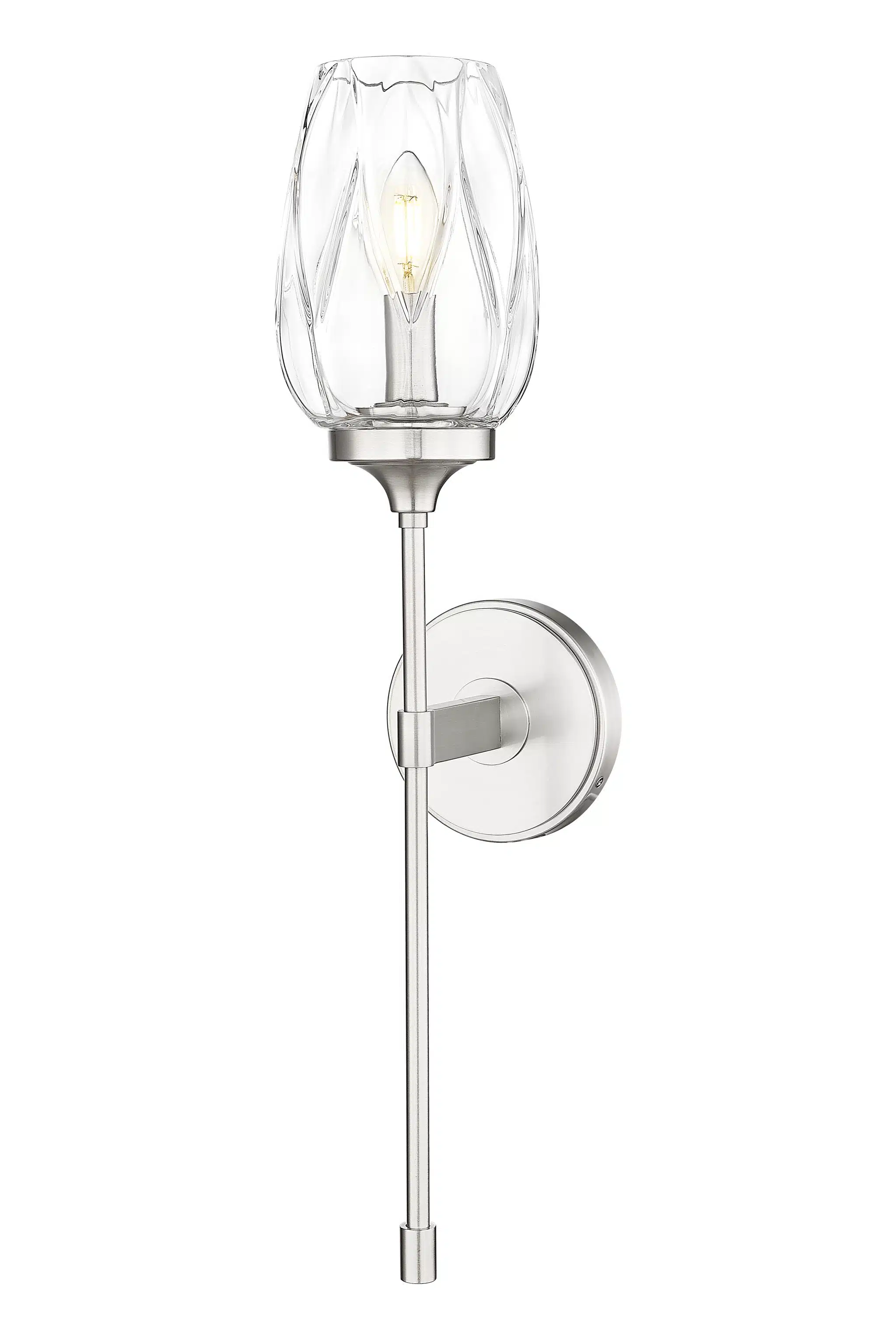 Le verre tulipe, subtilement texturé, met en valeur les lignes épurées et l’élégance de cette applique murale transitionnelle à une lumière. Sa tige fine et allongée évoque une fleur ou un verre à vin, apportant une touche de caractère à votre salon, votre séjour ou votre salle de bain. Une finition nickel brossé et une plaque murale ronde et lisse complètent l’ensemble.