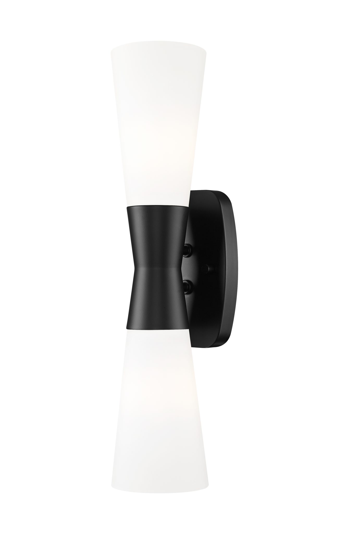 Un contraste saisissant de couleurs confère une allure remarquable à cette applique murale à deux lumières d’inspiration Art déco, idéale pour les salles à manger, les couloirs, les salons et les chambres. Son design relativement simple comprend une structure en acier noir mat avec une fixation murale élégante et un support central resserré, tandis que des abat-jour inversés en verre opale mat diffusent une lumière à intensité variable, permettant de créer l’ambiance souhaitée.