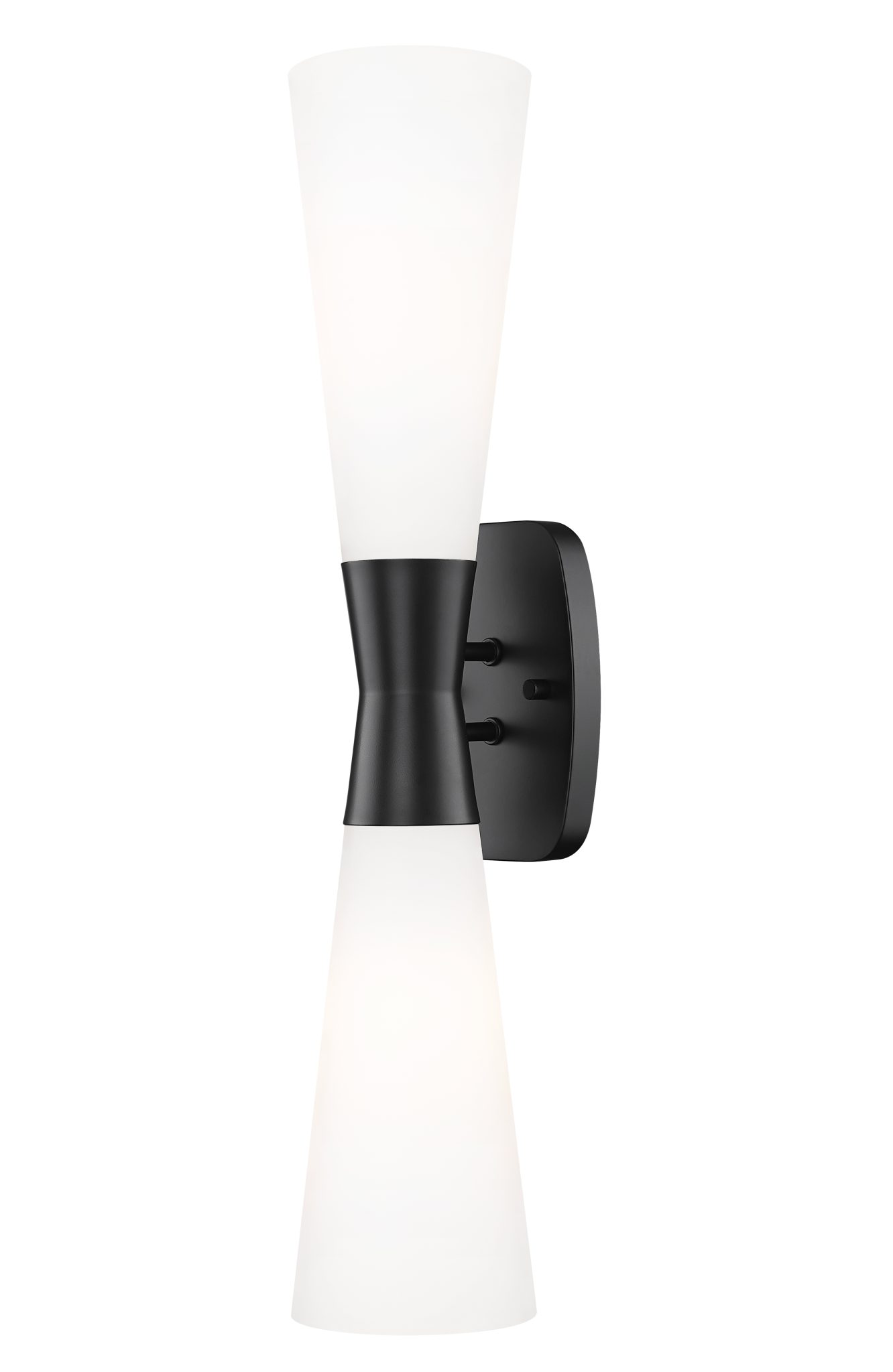 Une élégante orientation verticale confère à cette applique murale à deux lumières une silhouette en sablier et une palette de couleurs contrastées du plus bel effet. Les motifs urbains et Art déco se mêlent harmonieusement dans ce luminaire à la structure en acier noir mat, ornée d’un support central resserré du plus bel effet. Les abat-jour coniques en verre opale mat s’inversent pour diffuser uniformément un éclairage à intensité variable.
