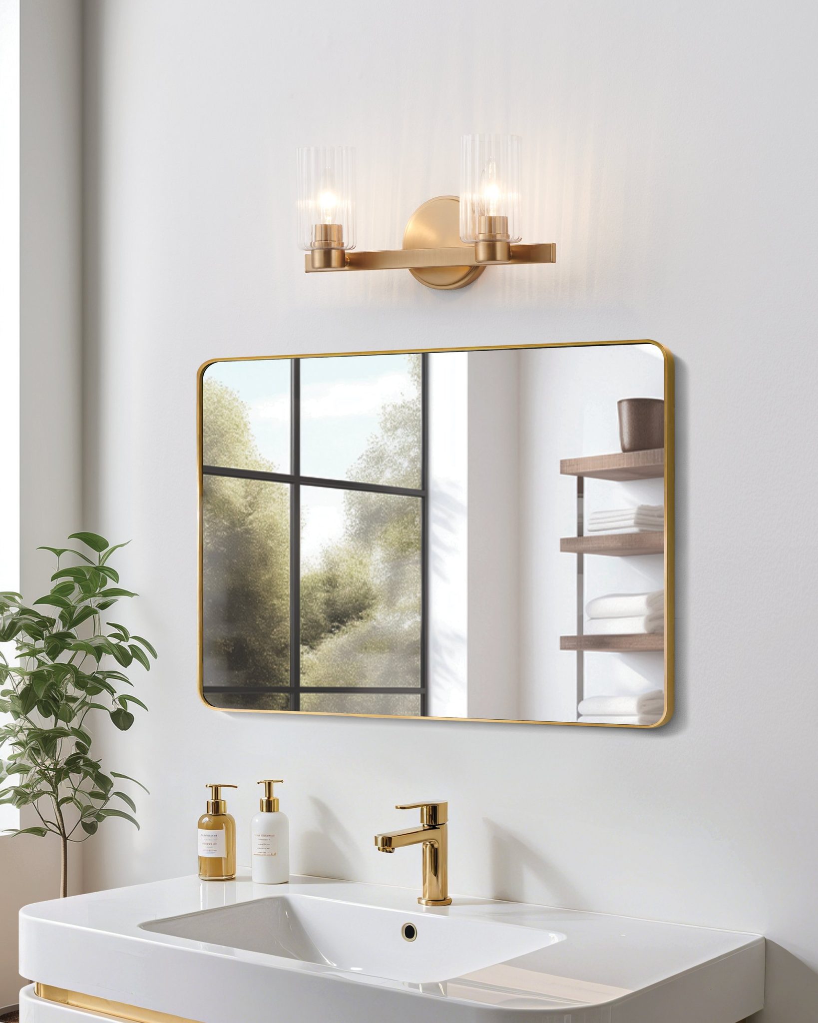 La murale de salle de bain Bedminster dégage une chaleur raffinée grâce à sa finition en or champagne et à ses abat-jours en verre clair nervuré. Ses formes cylindriques élégantes soulignent le jeu subtil entre texture et lumière, projetant une lueur nette mais invitante. Entre style classique et touche contemporaine, elle complète les décors de la maison avec un charme évident.
