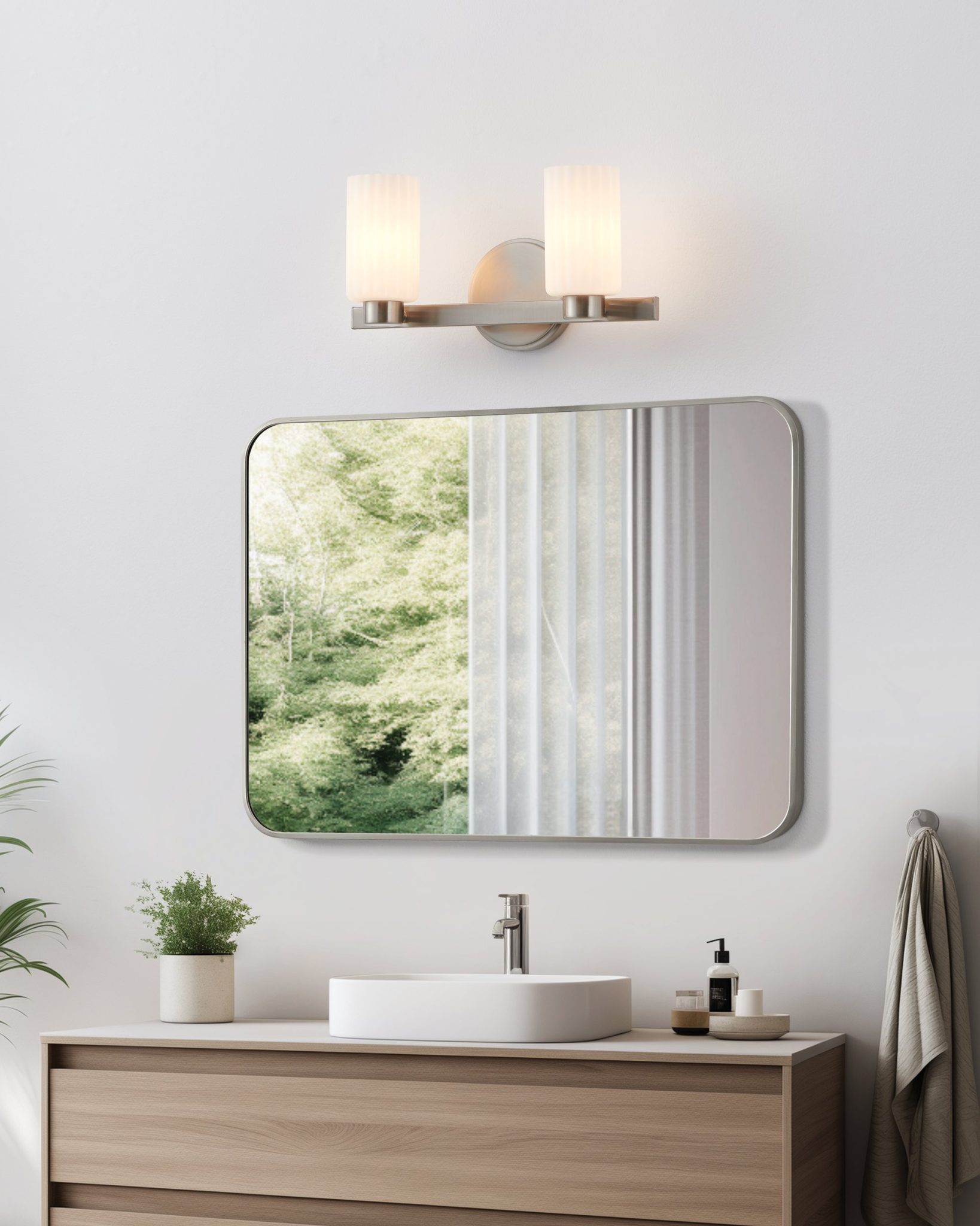 La murale de salle de bain Bedminster incarne une élégance intemporelle avec sa finition en nickel brossé et ses abat-jours en verre opale nervuré. La surface gravée diffuse la lumière en une lueur chaude et uniforme, insufflant une douceur calme à toute pièce. Grâce à sa texture subtile et à sa forme équilibrée, elle s’intègre naturellement à tous les styles, du classique au contemporain.