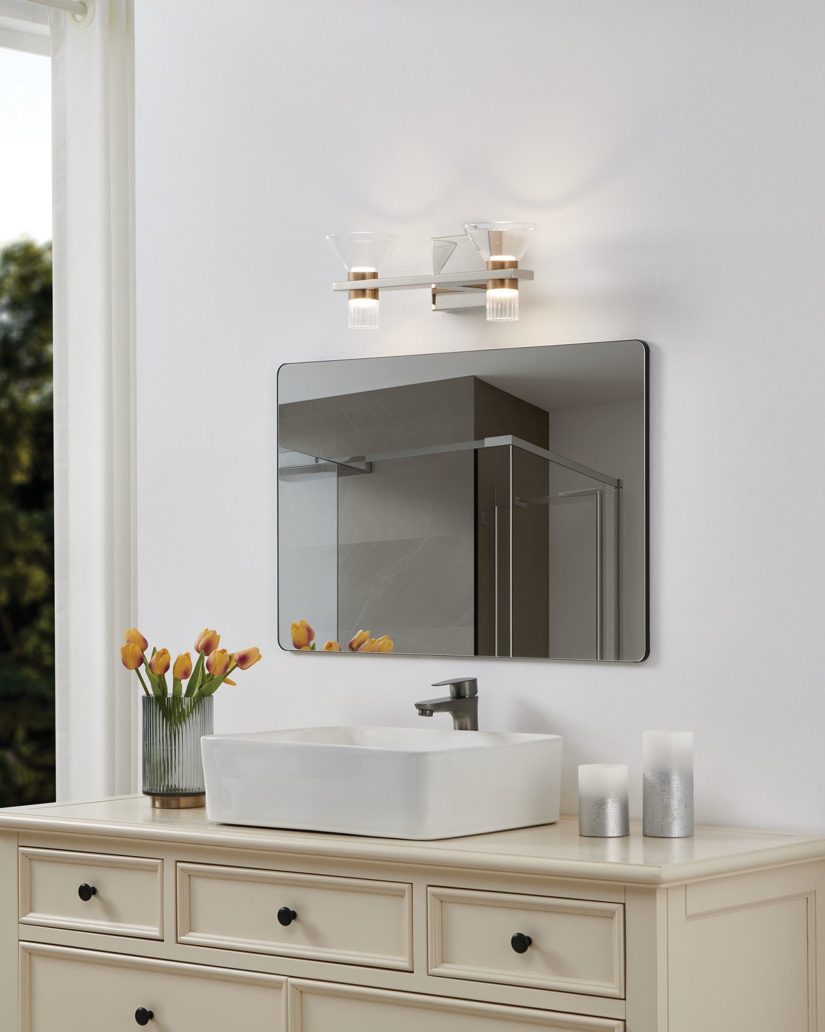 La murale de salle de bain Blake emprunte la silhouette de l’iconique verre à martini pour la transformer en jeu de lumière et de texture. Chaque abat-jour juxtapose un verre clair sur le dessus à un verre strié en dessous, créant un relief généreux tout en diffusant la lumière vers le haut et vers le bas. Un manchon métallique raffiné lie les formes entre elles, et les finis en nickel poli ainsi qu’en or champagne sont tous deux inclus pour permettre un rendu uniforme ou volontairement contrasté. Dotée de la technologie DEL intégrée 5CCT, la collection Blake marie un style intemporel à une grande flexibilité pour s’adapter aux espaces de vie d’aujourd’hui.