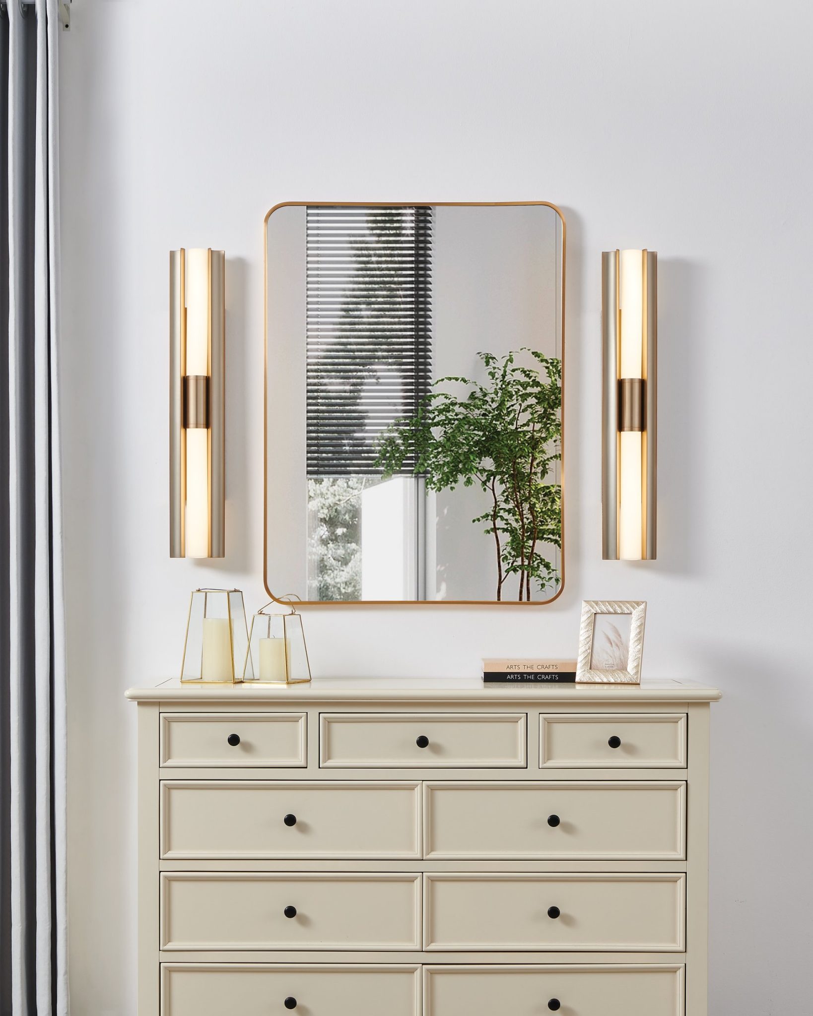 La murale de salle de bain Colton transforme le quotidien en un moment ritualisé. Ses cadres en or champagne aux courbes douces enveloppent des abat-jours en verre opale gravé, créant un équilibre gracieux entre géométrie et fluidité. Équipé de la technologie DEL 5CCT, Colton apporte une chaleur invitante et un luxe discret aux intérieurs modernes.