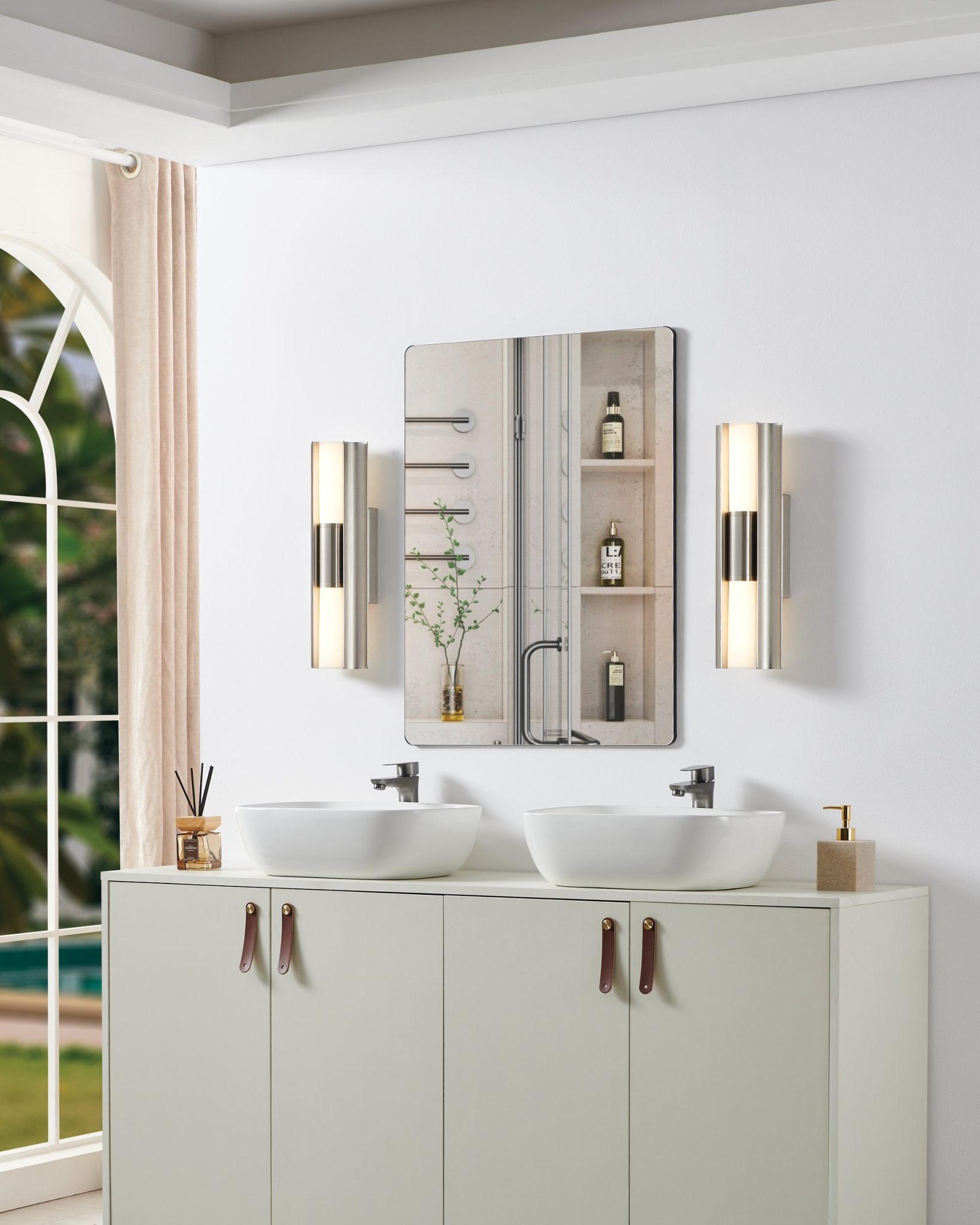 La murale de salle de bain Colton transforme le quotidien en un moment ritualisé. Les cadres en nickel brossé aux courbes douces entourent des abat-jours en verre opale gravé, créant une harmonie sereine entre géométrie nette et forme fluide. Avec sa technologie DEL 5CCT et son design raffiné, Colton offre une élégance intemporelle parfaitement adaptée aux intérieurs modernes.