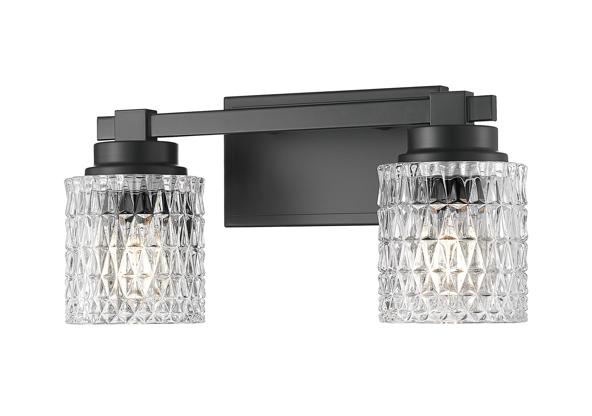 Une palette de couleurs variée confère une élégance spectaculaire à ce luminaire à deux lampes, idéal pour habiller la salle de bain principale et la salle de bain d’invités. Parfait également pour les espaces de vie ouverts, ce luminaire chic arbore un motif en losange sur ses abat-jour cylindriques en verre transparent, apportant une touche de texture. La structure en acier noir mat devient un élément dynamique et affirmé de ce luminaire à intensité variable.