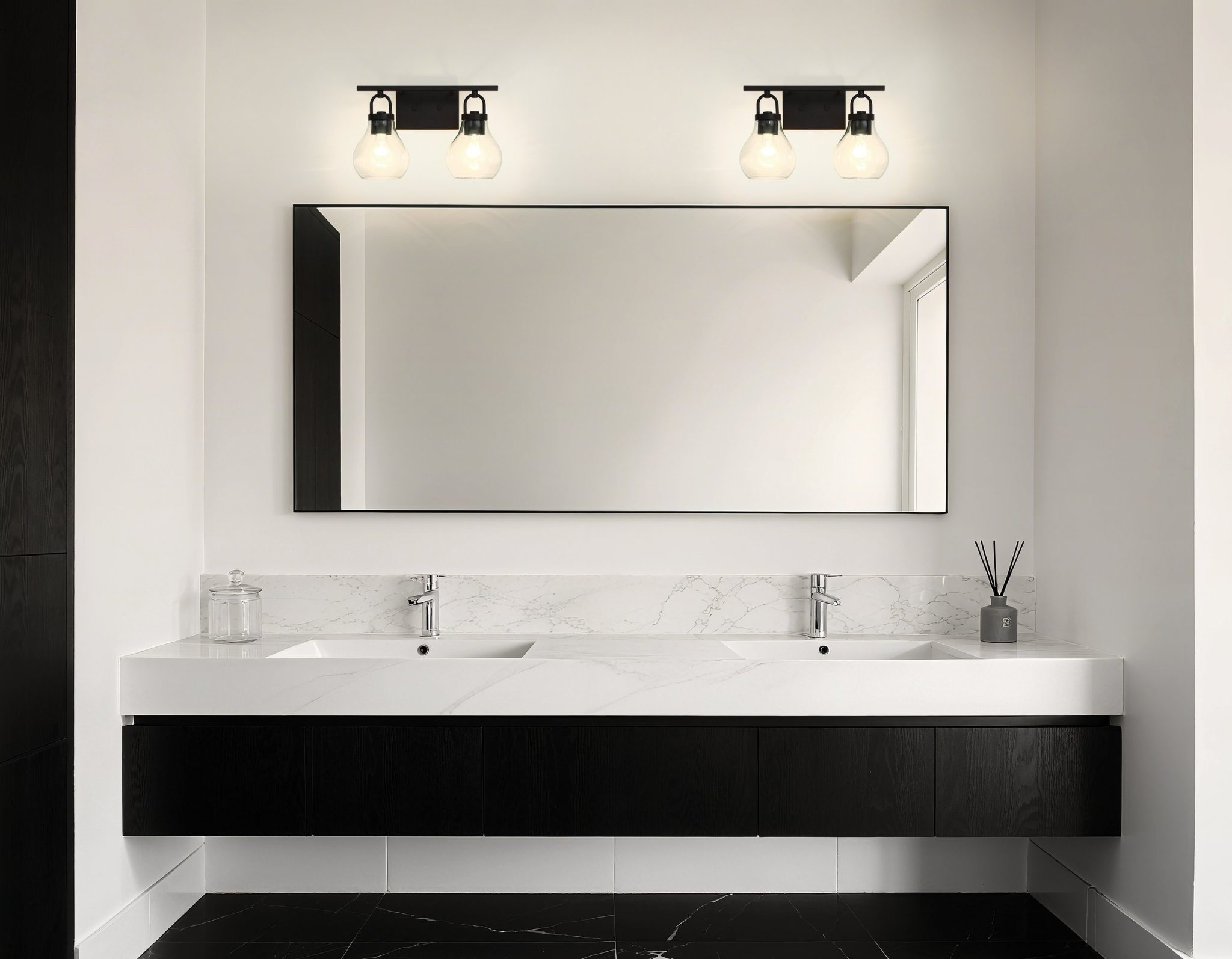 La murale de salle de bain Mansfield exprime un raffinement moderne à travers une simplicité gracieuse. Deux abat-jours en verre clair doucement évasé sont encadrés par une structure noire mate ornée des grandes boucles décoratives emblématiques de la collection. Grâce à son équilibre entre lignes nettes et courbes douces, Mansfield apporte une sophistication intemporelle aux salles de bain, salles d’eau et autres espaces.