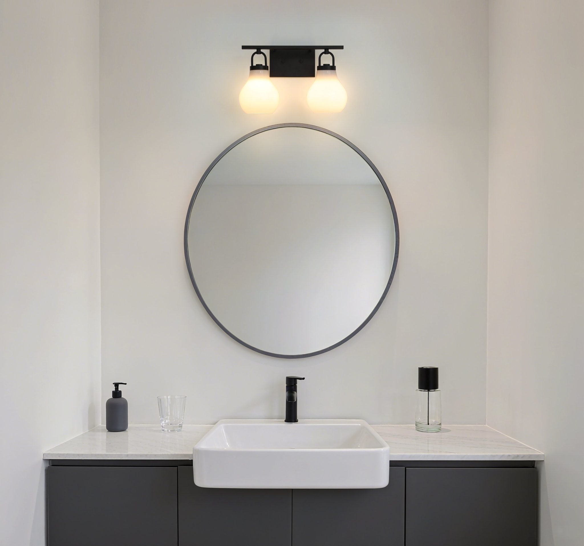 Découvrez Mansfield murale de salle de bain 16 po à 2 lumières noir mat avec abat-jours en verre opale