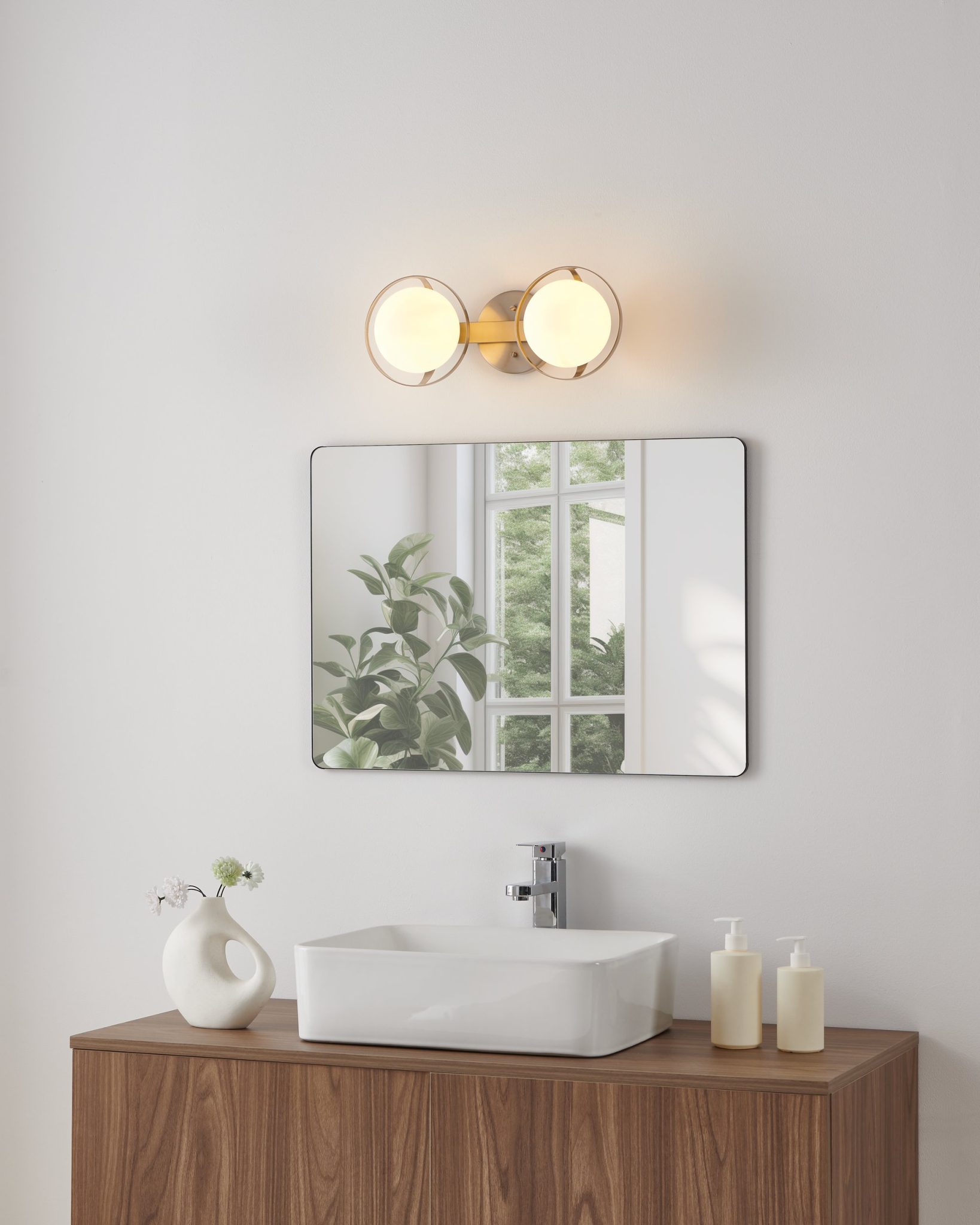 La collection de murales de salle de bain Parker propose une réinterprétation sophistiquée de l’éclairage hollywoodien classique, insufflant une touche de luxe modern-déco à la salle de bain ou à la salle d’eau. Des sphères en verre opale gravé sont encadrées par une fine bande métallique, apportant une esthétique plus formelle. L’équilibre entre courbes et retenue confère à Parker une allure posée, à la fois naturellement glamour et finement raffiné