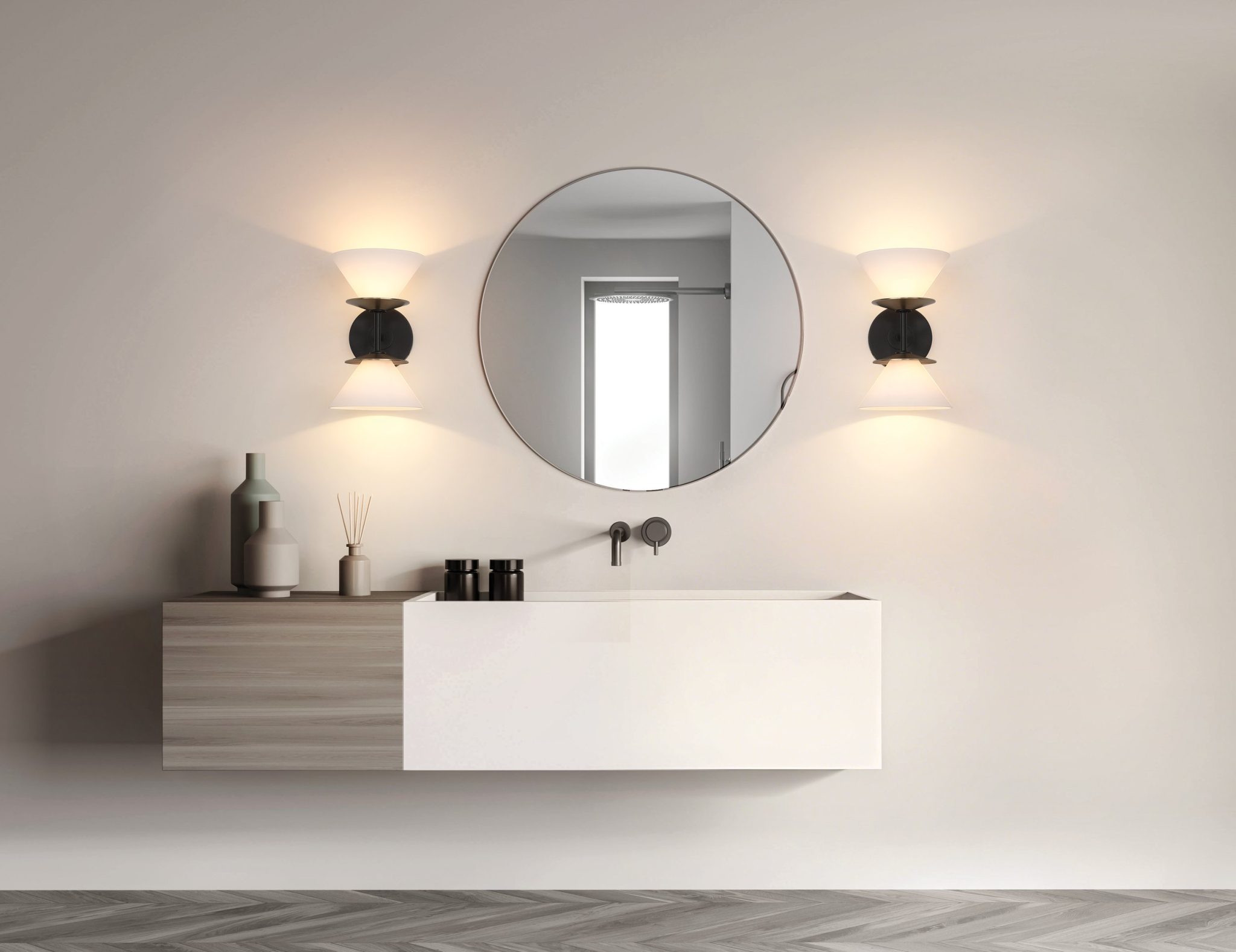 La murale de salle de bain Tremolo offre une interprétation raffinée du style du milieu du siècle dernier grâce à sa géométrie audacieuse et à ses abat-jours coniques évasés en verre opale gravé. Sa finition noire mate rehaussée d’accents en or champagne crée un contraste riche, tandis que chaque abat-jour repose dans une coupelle inclinée accompagnée de disques métalliques interchangeables pour une touche personnalisée. Tremolo marie ainsi le luxe moderne et une présence chaleureuse qui complète tout espace.