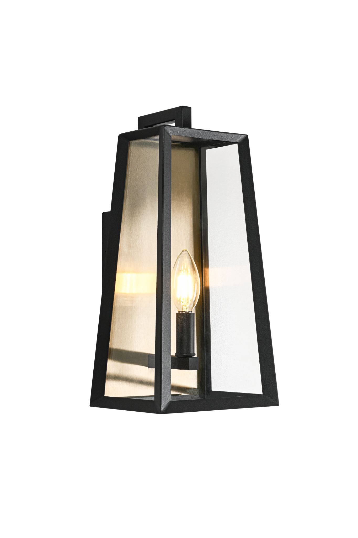 Aviv. Ce luminaire présente un design rectangulaire fuselé et élégant, avec une structure en fer noir mat et une plaque arrière couleur or champagne qui reflète subtilement la lumière pour une ambiance chaleureuse. Des panneaux de verre transparent entourent une ampoule de type bougie, diffusant une lueur douce et accueillante. Sa silhouette géométrique minimaliste allie modernité et classicisme, ce qui le rend idéal pour les entrées, les garages, les terrasses ou les vérandas. AMPOULES NON INCLUSES