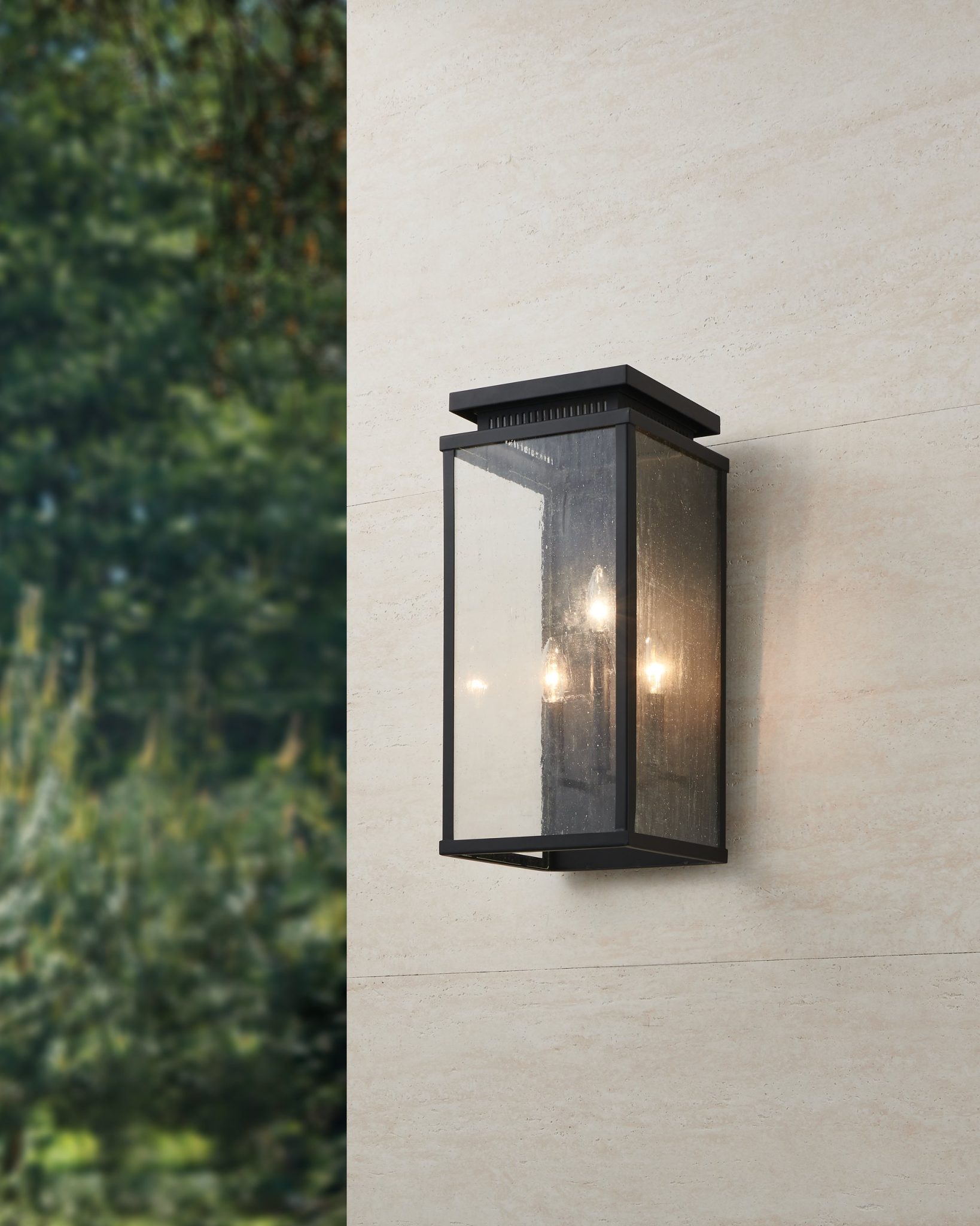 Élégante et imposante, la murale extérieure Overton propose une version actualisée de la lanterne murale de type pocket. Des panneaux en verre antique clair insérés dans un cadre rectangulaire épuré sont surmontés de détails de toit classiques qui ajoutent du caractère et de la sophistication. De simples chandelles contrastent avec une plaque arrière complète en métal, tandis qu’un ensemble de manchons de bougies interchangeables, offerts en trois finis, offre des possibilités de personnalisation.