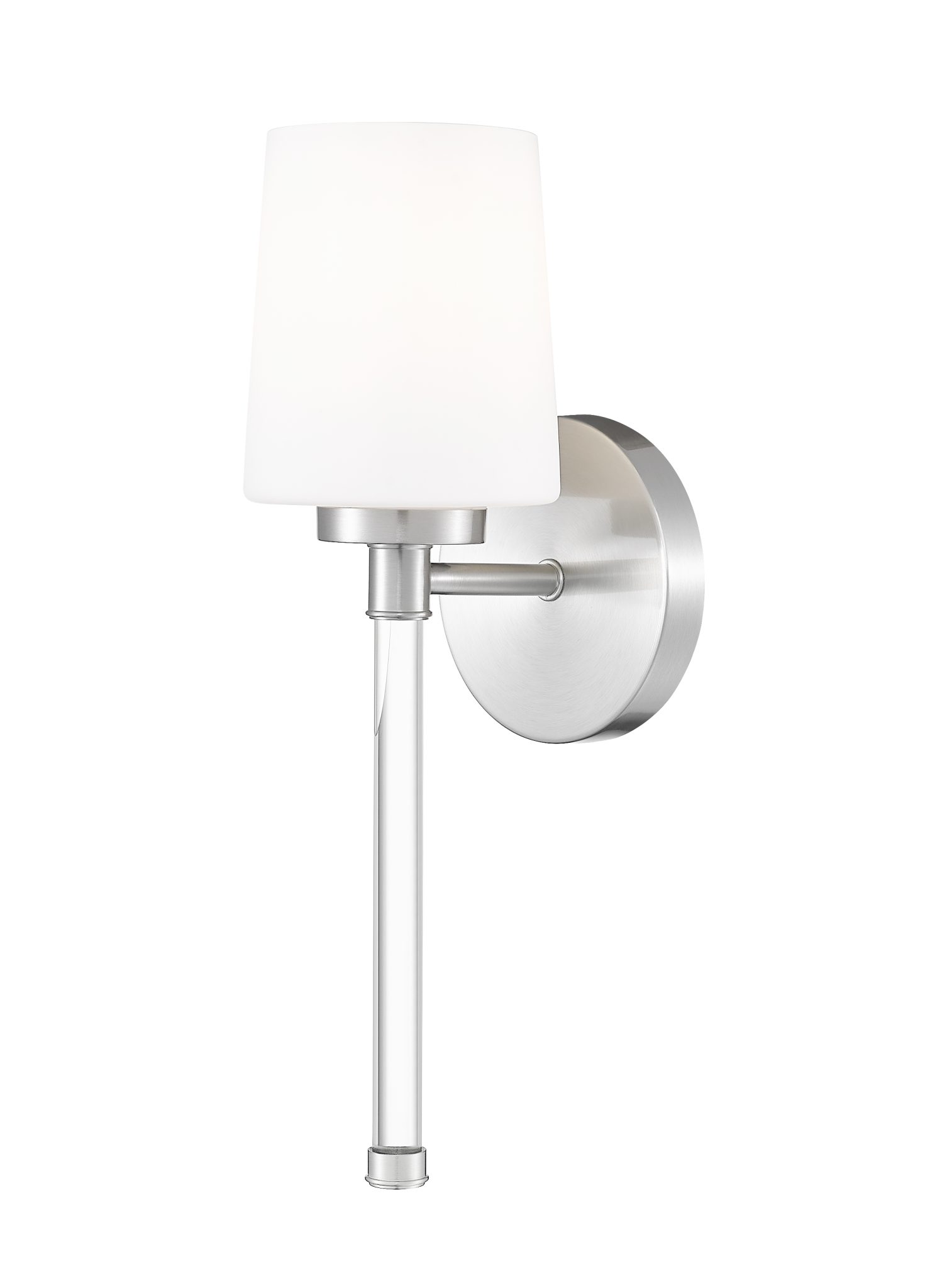 Avec sa plaque de fixation assortie et sa fine tige en cristal, cette applique murale en nickel brossé à une lumière évoque un bougeoir moderne posé sur le mur, apportant l’éclat du métal et du verre à une surface peinte sobre. L’abat-jour en verre opale blanc transforme les ampoules vives en une lumière douce et flatteuse qui adoucit les miroirs et les carreaux, créant ainsi une ambiance feutrée et chaleureuse dans une salle de bain, un coin de chambre ou un couloir. Utilisez-la seule pour une touche de subtilité ou alignez-en plusieurs le long d’une coiffeuse : ce luminaire polyvalent habille l’espace d’une élégance naturelle et décontractée.