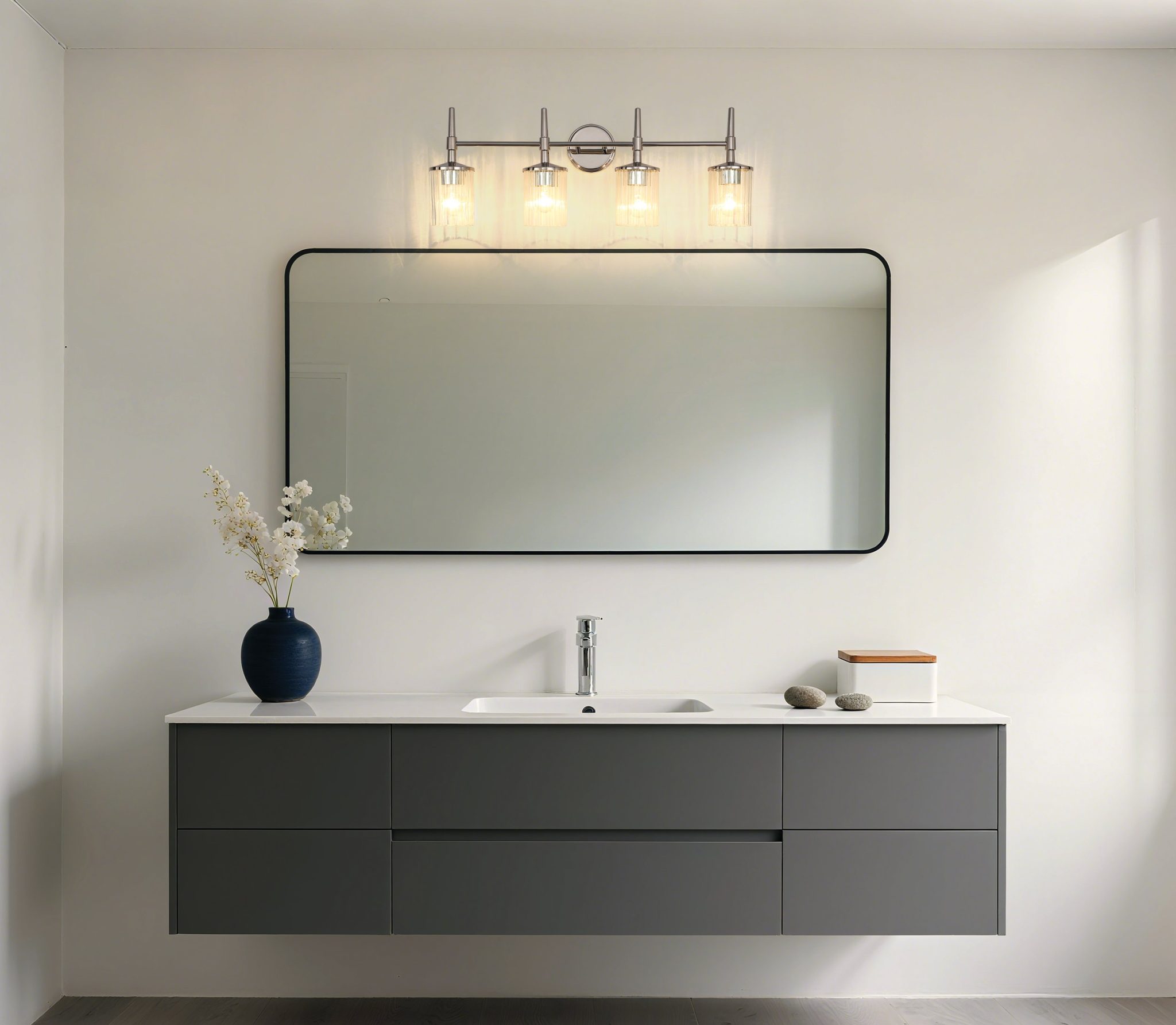 Découvrez Andrea murale de salle de bain 32 po à 4 lumières nickel poli avec abat-jours en verre clair nervuré