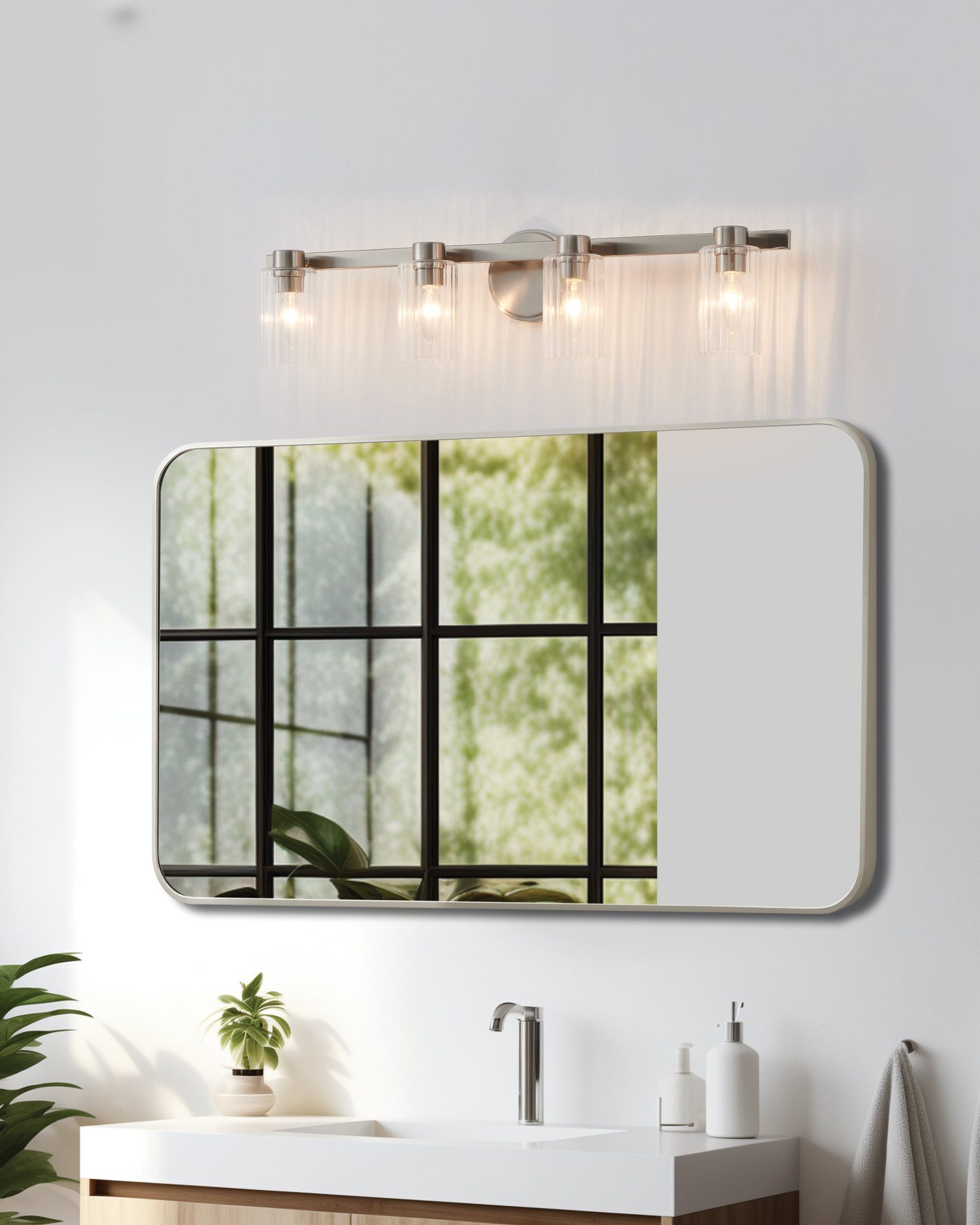 La murale de salle de bain Bedminster exprime un raffinement durable avec sa finition en nickel brossé et ses abat-jours en verre clair nervuré. Quatre cylindres élégants mettent en valeur le jeu entre lumière et texture, projetant une lueur vive mais mesurée. Grâce à ses lignes nettes et à sa simplicité polie, elle s’intègre avec aisance dans les décors classiques comme modernes.