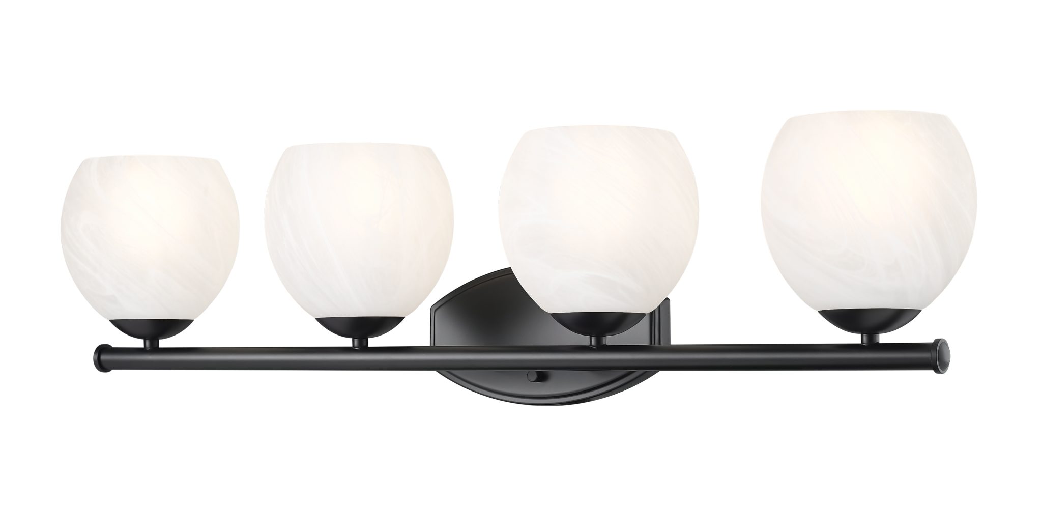 Le noir profond apporte une touche d’élégance et de profondeur à ce luminaire de salle de bain à quatre lumières de la collection Colette. Son design épuré et raffiné se caractérise par des courbes gracieuses sur sa plaque murale et une barre droite supportant quatre abat-jour arrondis. Chaque abat-jour arbore un motif tourbillonnant blanc opaque vaporeux, diffusant une lumière douce et flatteuse pour tous vos besoins quotidiens.