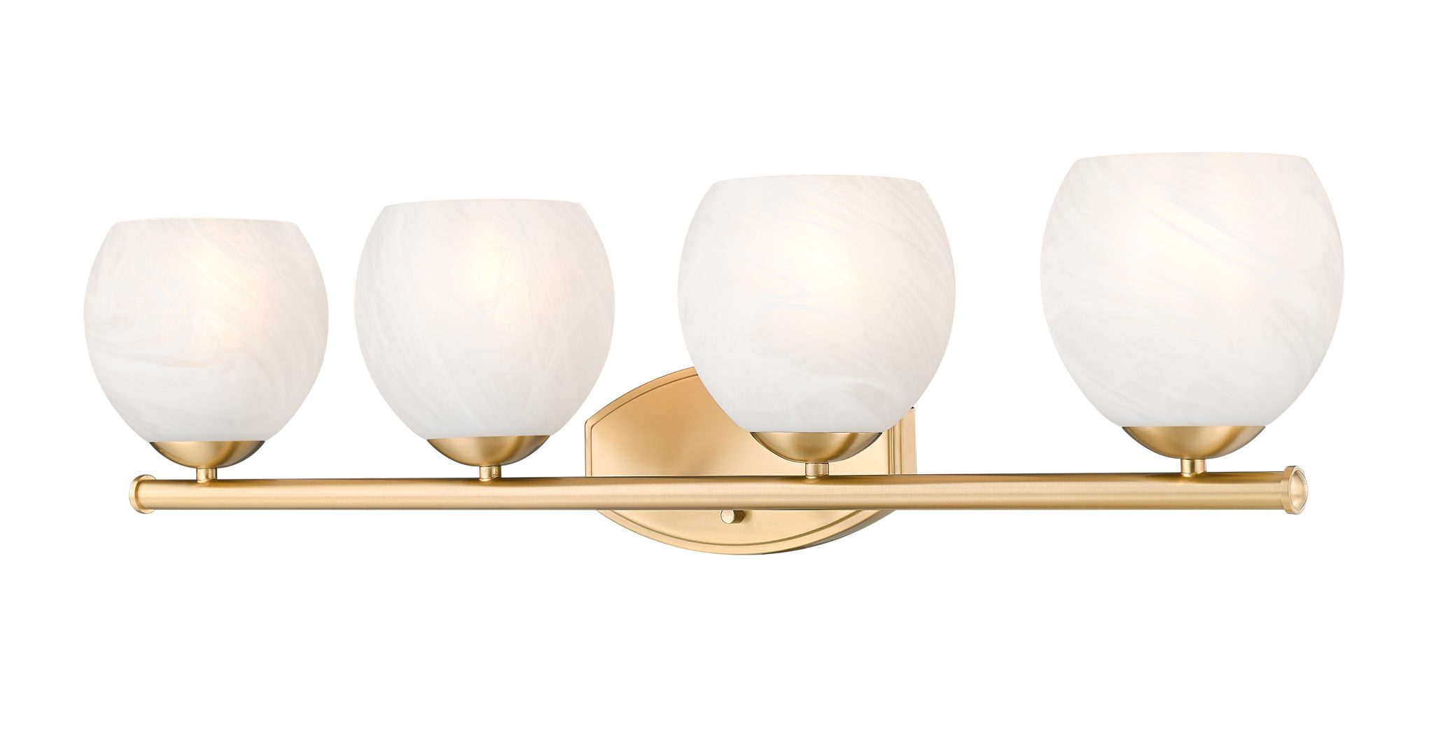 Adoptez un style riche et raffiné avec les courbes gracieuses et la finition dorée moderne et éclatante de ce luminaire de salle de bain transitionnel à quatre lumières. Plein de personnalité, ce luminaire se compose d’une plaque murale incurvée et d’une barre droite, offrant des lignes épurées qui s’harmonisent avec pratiquement toutes les salles de bain. Les quatre abat-jour en verre aux formes légèrement arrondies arborent un motif tourbillonnant blanc opaque délicat qui adoucit la lumière sans en altérer la luminosité, idéal pour vos rituels de beauté et de soins quotidiens.
