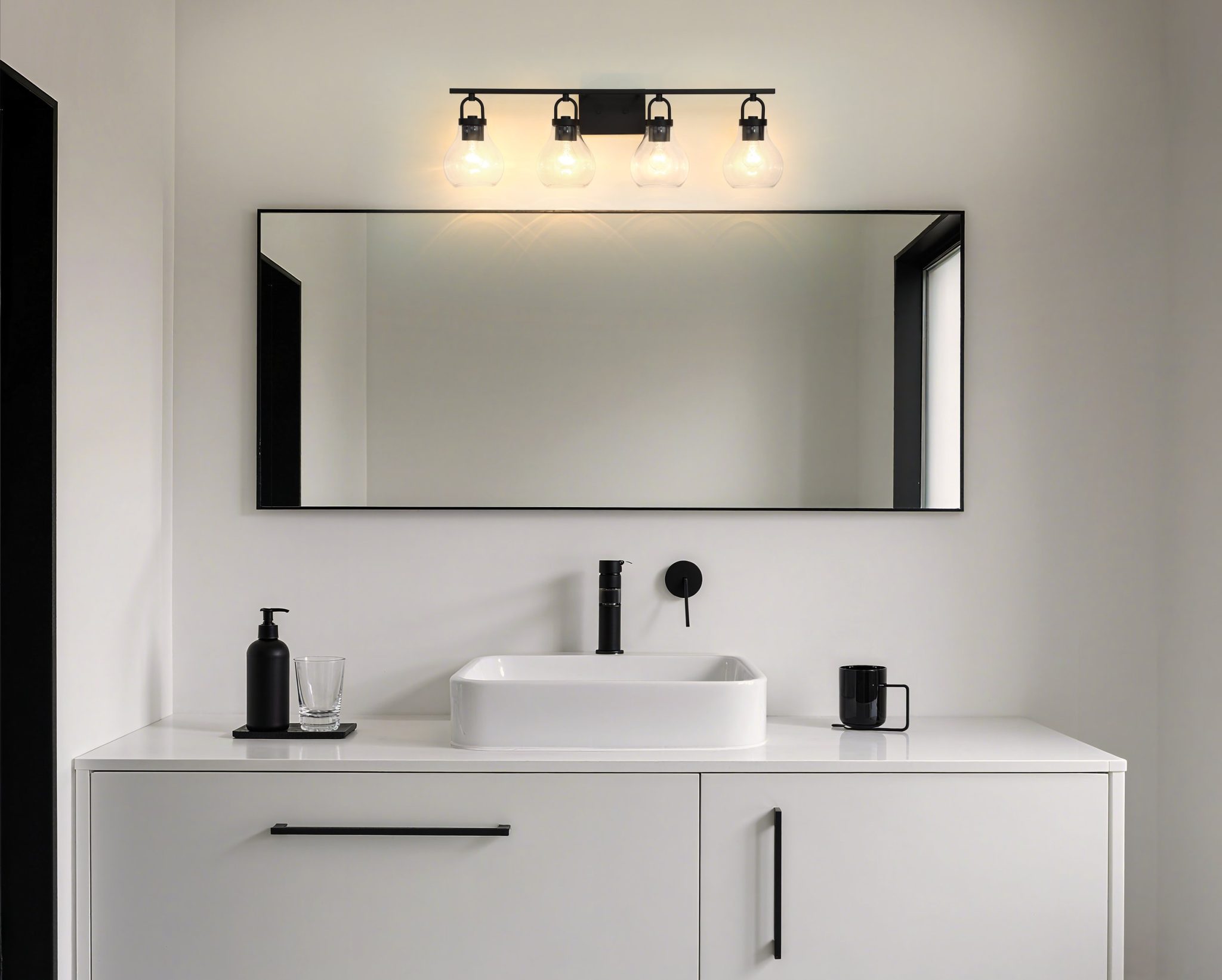Découvrez Mansfield murale de salle de bain 34 po à 4 lumières noir mat avec abat-jours en verre clair