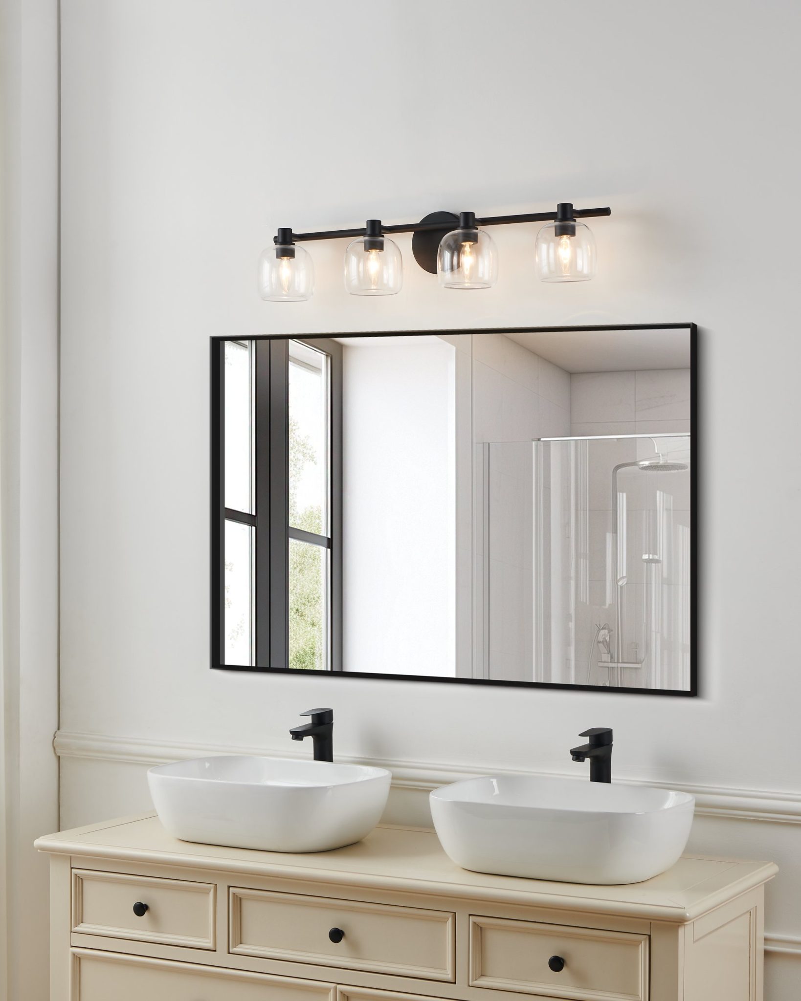 Découvrez Valentina murale de salle de bain 30 po à 4 lumières noir mat avec abat-jours en verre clair