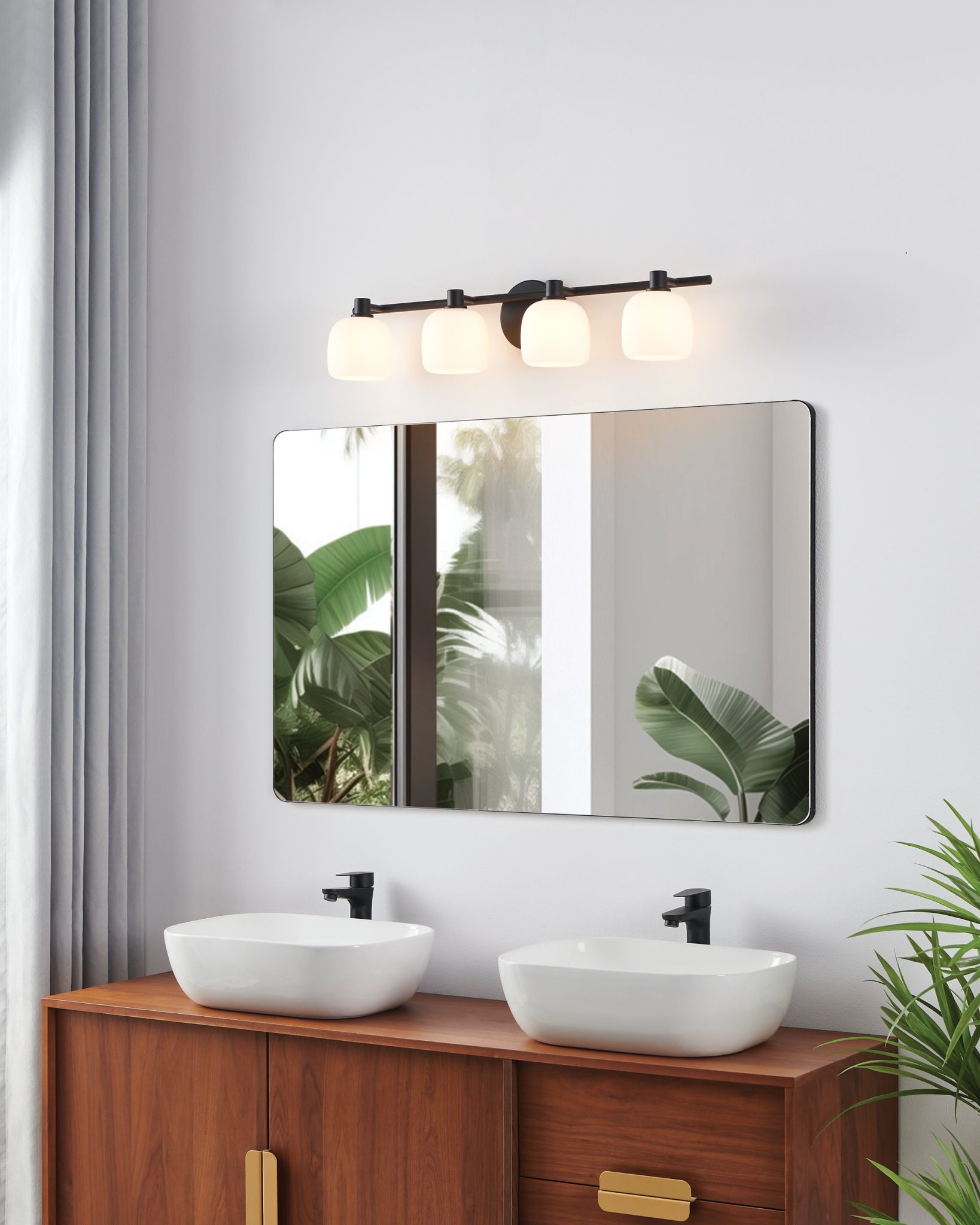 La collection de murales de salle de bain Valentina en noir mat, au caractère accueillant, présente des abat-jours arrondis en verre opale gravé associés à un bras en métal simple mais affirmé. L’équilibre harmonieux de cette murale de salle de bain à quatre lumières se décline dans une large palette de combinaisons verre/métal pour convenir à chaque aménagement. La finition noir mat introduit un contraste affirmé et une sophistication contemporaine qui rehaussent toute salle de bain ou de salle d’eau.