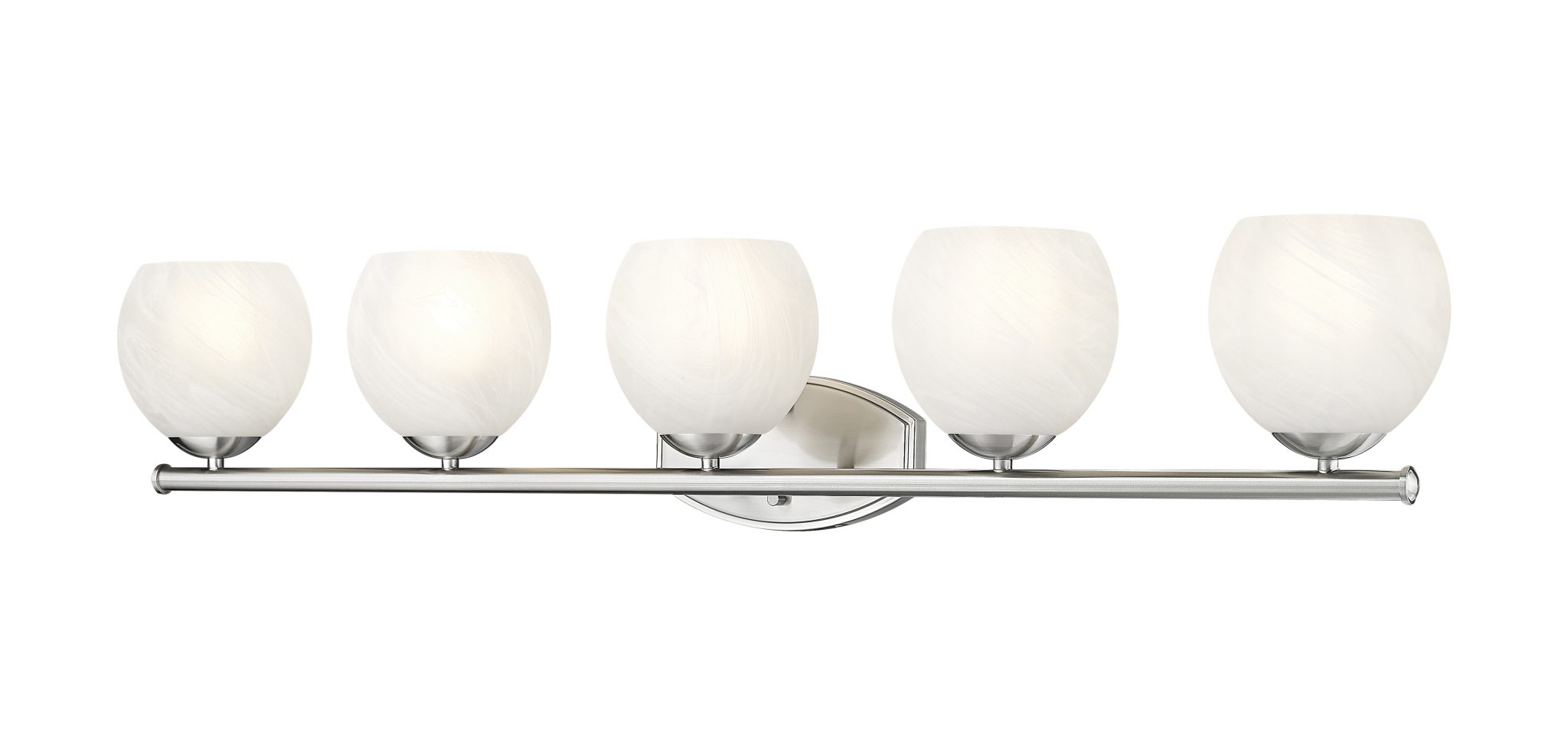 Illuminez un grand plan de travail avec élégance grâce à ce luminaire de salle de bain transitionnel à cinq lumières. Sa finition en nickel brossé souligne parfaitement son style intemporel, tandis que sa plaque murale incurvée et sa barre droite lui confèrent une touche de personnalité subtile. Les abat-jour en verre diffusent une lumière douce et vive, ornée d’un motif tourbillonnant blanc opaque, à la fois tendance et d’un charme intemporel.
