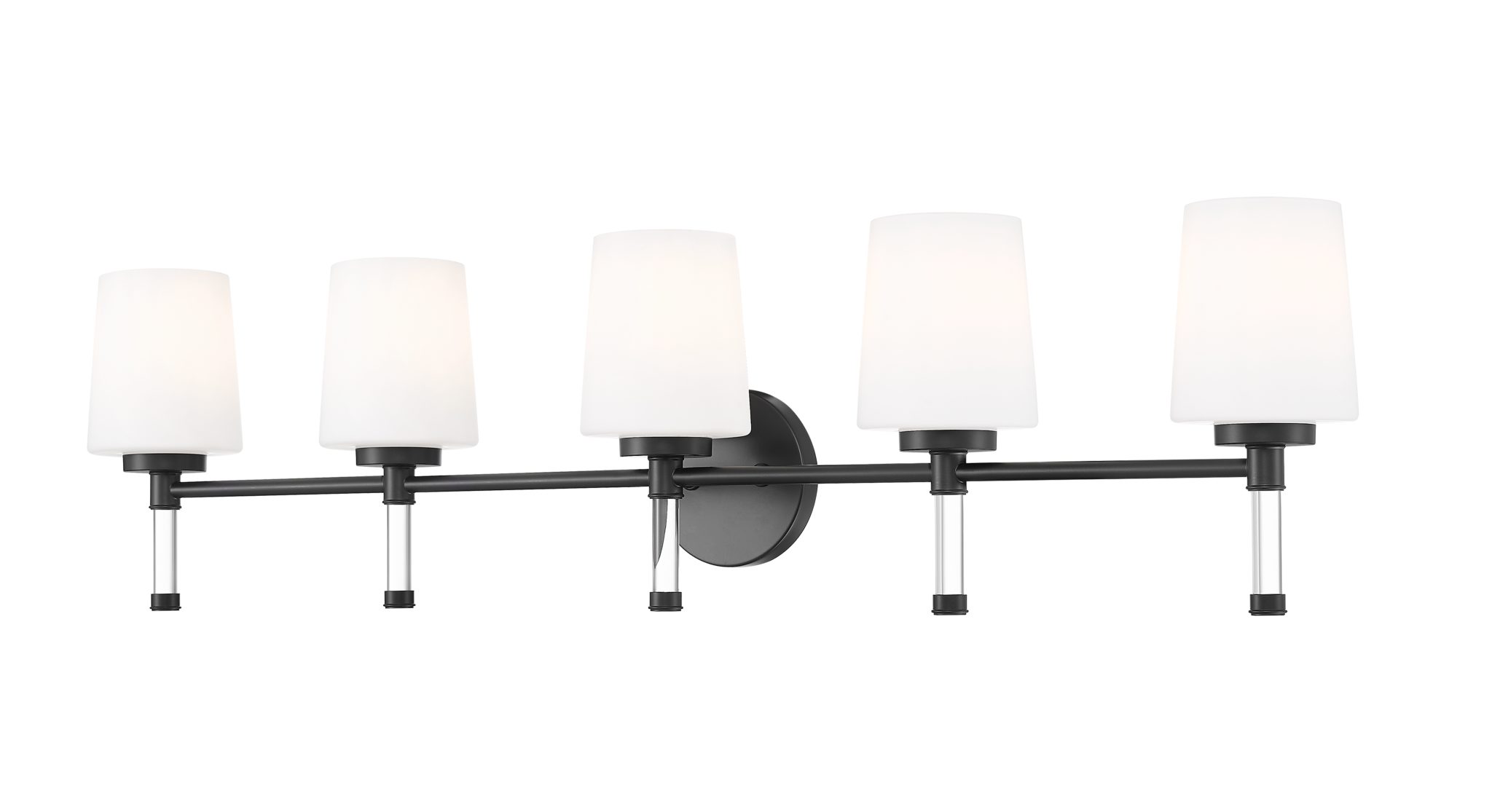 Sur un carrelage clair ou des meubles peints, la finition noire mate profonde de cette applique murale à cinq lumières dessine une ligne horizontale affirmée, conférant à la pièce une allure théâtrale. Cinq abat-jour en verre opale semblent flotter sur des tiges transparentes, ce qui confère à la lampe une impression de légèreté tout en diffusant un éclairage généreux, idéal pour les lavabos partagés et les moments de vie en famille. Dans une maison de campagne moderne, un loft ou une rénovation épurée, elle fait le lien entre les textures rustiques et les détails contemporains, assurant à l’ensemble une atmosphère à la fois soignée et élégante.
