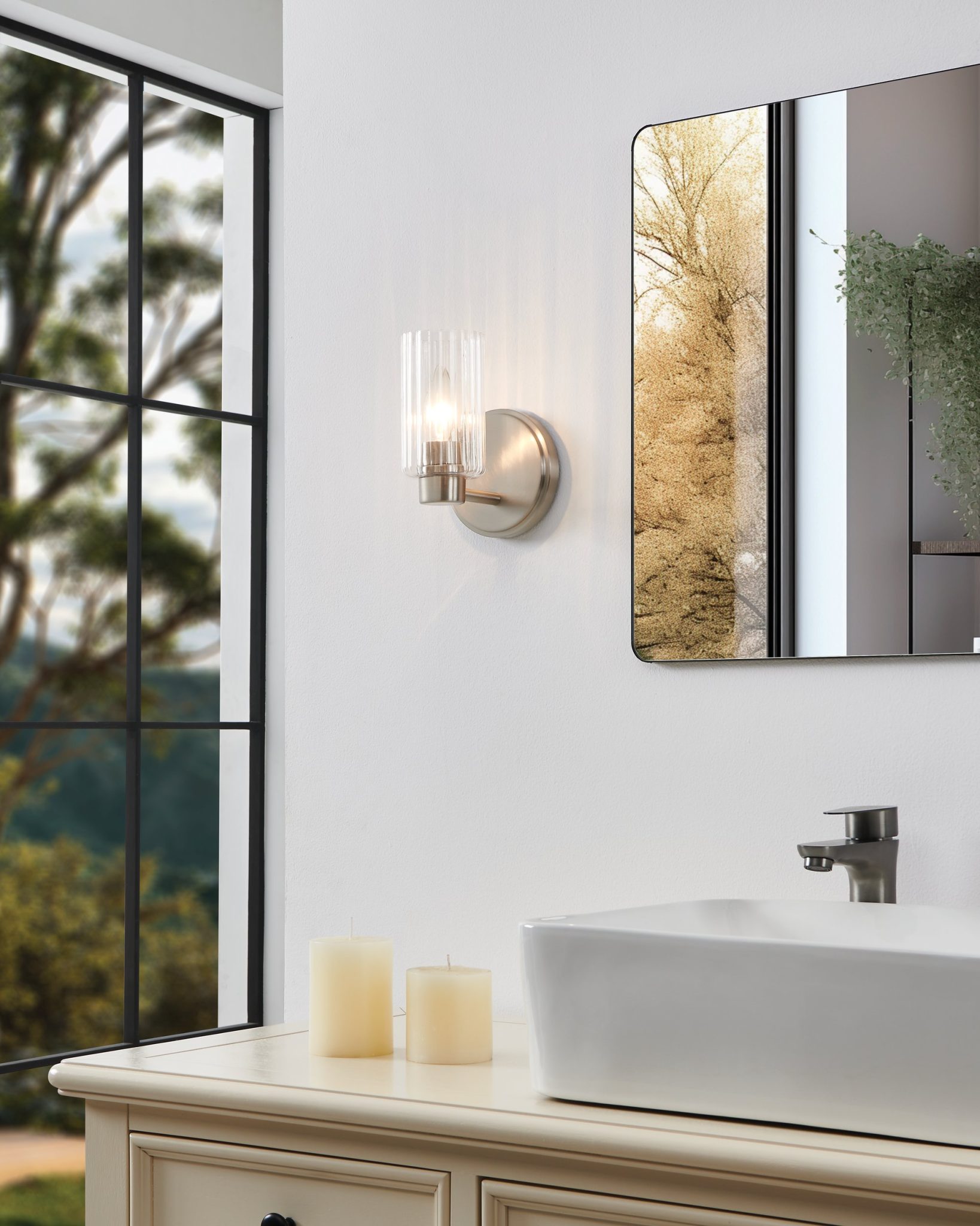 Découvrez Bedminster murale de salle de bain 5 po à 1 lumière nickel brossé avec abat-jour en verre clair nervuré