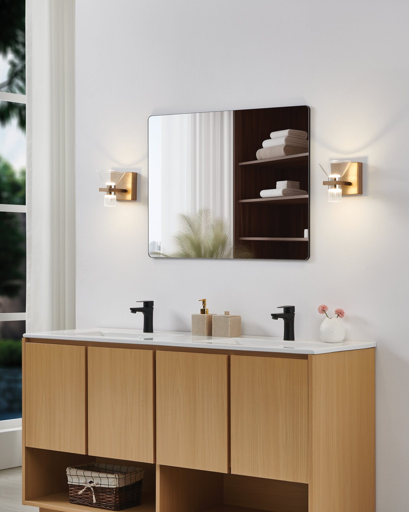 La murale de salle de bain Blake puise son inspiration dans l’iconique verre à martini, dont il réinterprète la silhouette en un jeu de lumière et de texture. Chaque abat-jour combine un verre clair dans la partie supérieure et un verre strié dans la partie inférieure, une composition qui ajoute du relief tout en diffusant la lumière vers le haut et vers le bas. Offert en or champagne et en nickel poli, avec les deux finis inclus pour un rendu uniforme ou contrasté, Blake marie design raffiné et technologie DEL intégrée 5CCT pour un style durable et flexible.