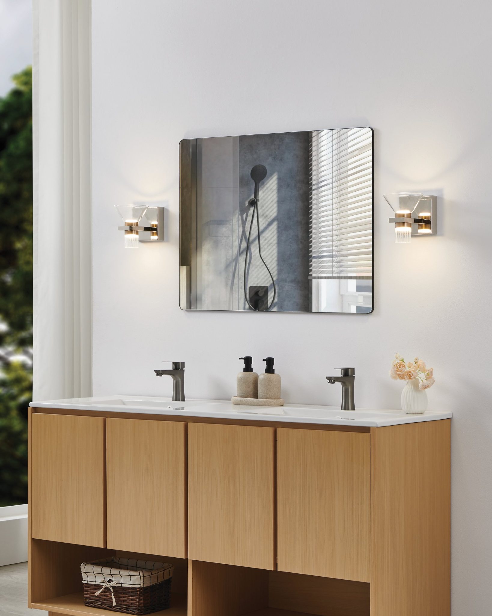 La murale de salle de bain Blake s’inspire du verre à martini classique et transforme sa silhouette en une véritable sculpture de lumière et de texture. Chaque abat-jour rassemble un verre clair sur le dessus et un verre strié au bas, créant de la profondeur et diffusant la lumière vers le haut et vers le bas. Un élégant manchon métallique unifie l’ensemble et, comme les finis en nickel poli et en or champagne sont tous deux inclus, le look peut être uniforme ou contrasté selon le décor. Avec sa technologie DEL intégrée 5CCT, la collection Blake combine un style durable et la flexibilité nécessaire pour répondre aux réalités d’aujourd’hui.