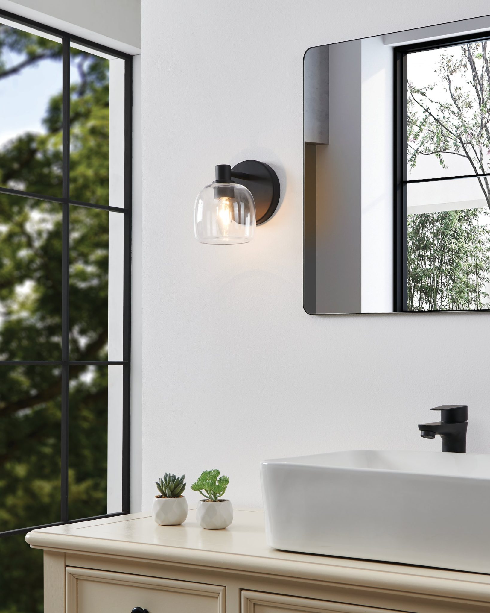 La collection de murales de salle de bain Valentina en noir mat présente un abat-jour en verre clair au profil doucement arrondi, associés à un bras en métal simple mais affirmé. Cette murale de salle de bain à une lumière propose un design visuellement accueillant qui marie courbes douces et structure moderne. La finition noir mat apporte une sophistication polyvalente qui s’intègre naturellement à une grande variété de salles de bain et salle d’eau.