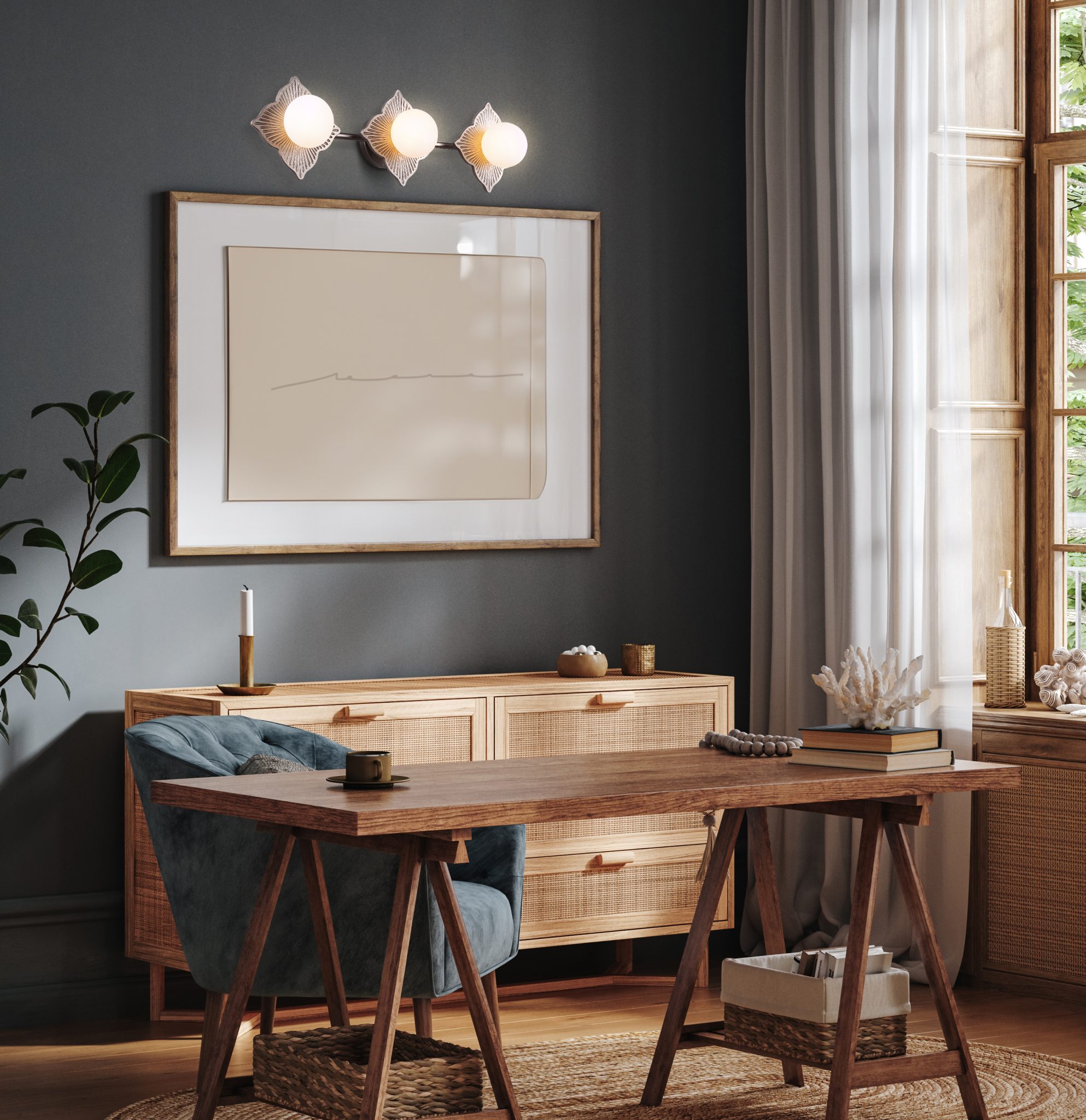L’applique murale GIANNA célèbre un design moderne et éclectique empreint d’un esprit maximaliste. Sa structure en or brossé se marie à des courbes ornementales qui évoquent subtilement les motifs floraux et Art déco. Sa présence sculpturale est magnifiée par trois abat-jour sphériques en verre opale, diffusant une lumière douce et homogène pour une ambiance chaleureuse et envoûtante. Avec ses 72,4 cm de diamètre, GIANNA habille un mur avec assurance, trouvant sa place au-dessus d’un miroir de salle de bain, à côté d’un lit ou comme élément décoratif dans un salon ou une salle à manger. Conçue pour trois ampoules G9 de 40 W, elle allie détails artistiques et éclairage fonctionnel. Grâce à son installation Easy Connect, cette applique allie simplicité et praticité, sublimant un design qui se distingue par sa richesse, sa géométrie expressive et son luxe audacieux et éclectique.