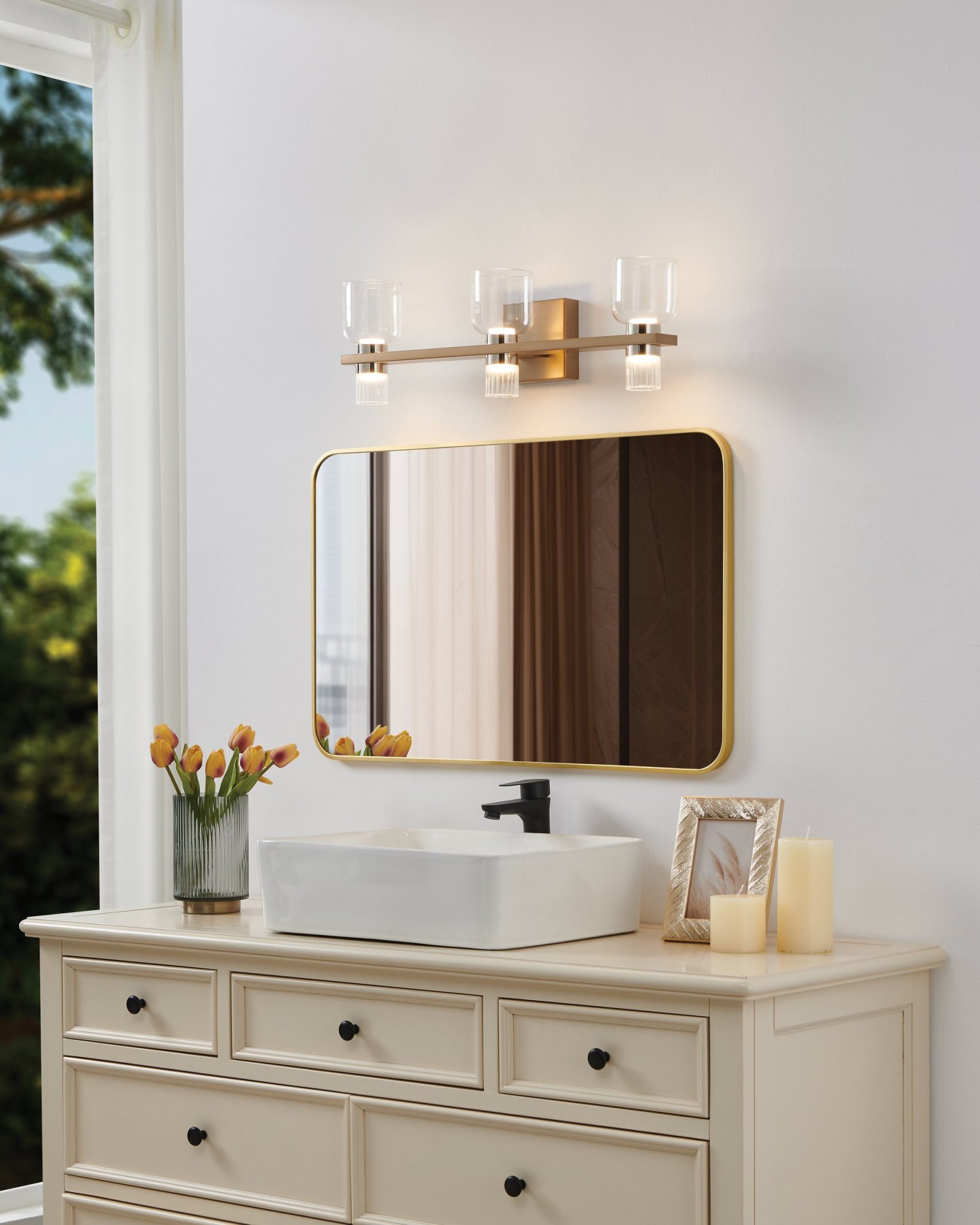 Inspirée par l’élégance des verres à cocktail vintage, la collection de murales de salle de bain Amelia marie une simplicité saisissante à des détails soignés. Ses abat-jours superposés, clairs au sommet et nervurés à la base, sont rehaussés d’un manchon en métal ajusté pour une touche raffinée. Des anneaux décoratifs, proposés en fini assorti ou complémentaire, sont inclus pour personnaliser le look selon vos préférences. Conçus pour une polyvalence maximale, les luminaires peuvent être installés vers le haut ou vers le bas, tandis que la technologie DEL 5CCT intégrée et ajustable crée l’ambiance parfaite pour tout décor.