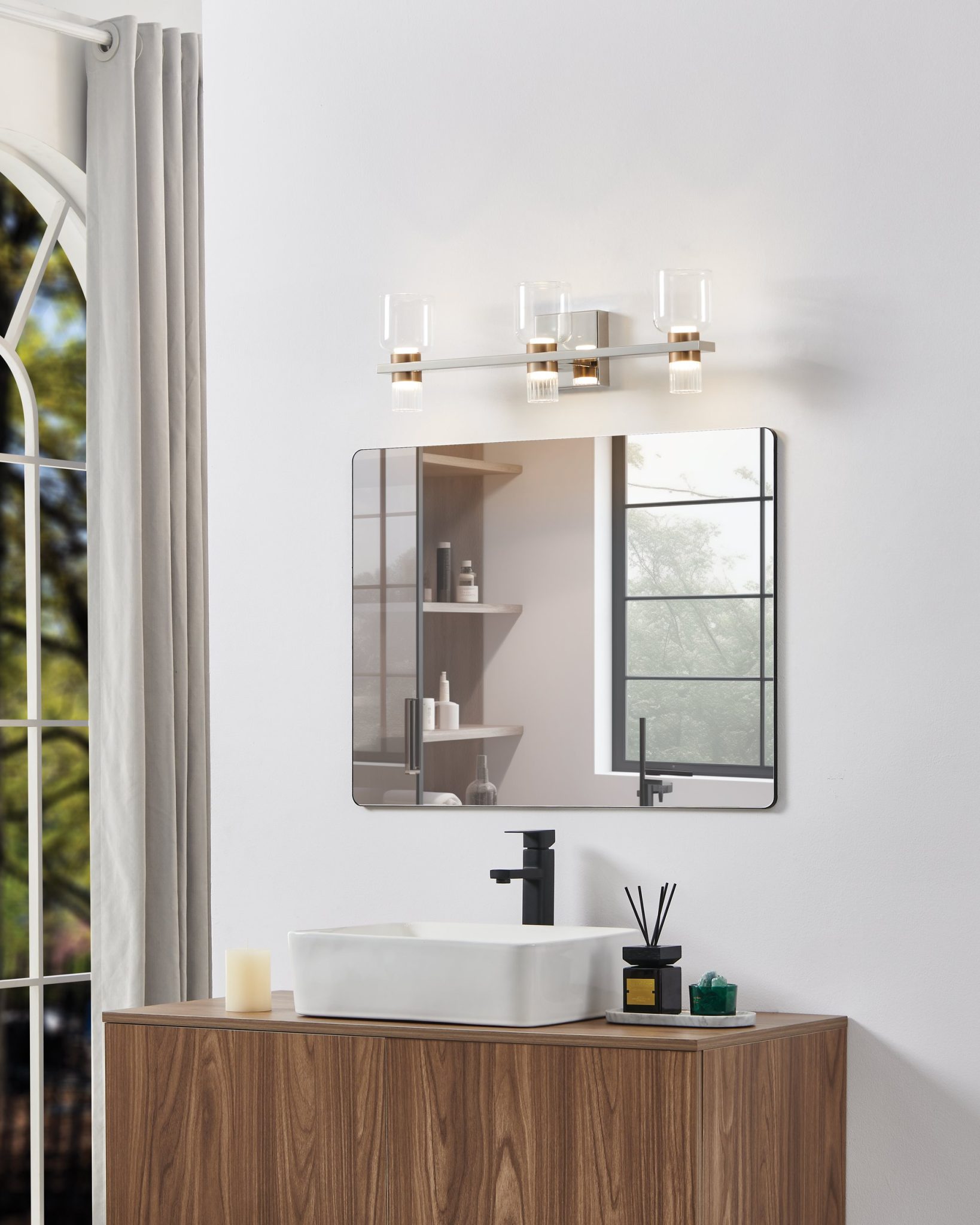 Découvrez Amelia murale de salle de bain DEL 5CCT 24 po à 6 lumières nickel poli et or champagne avec verre clair et clair nervuré