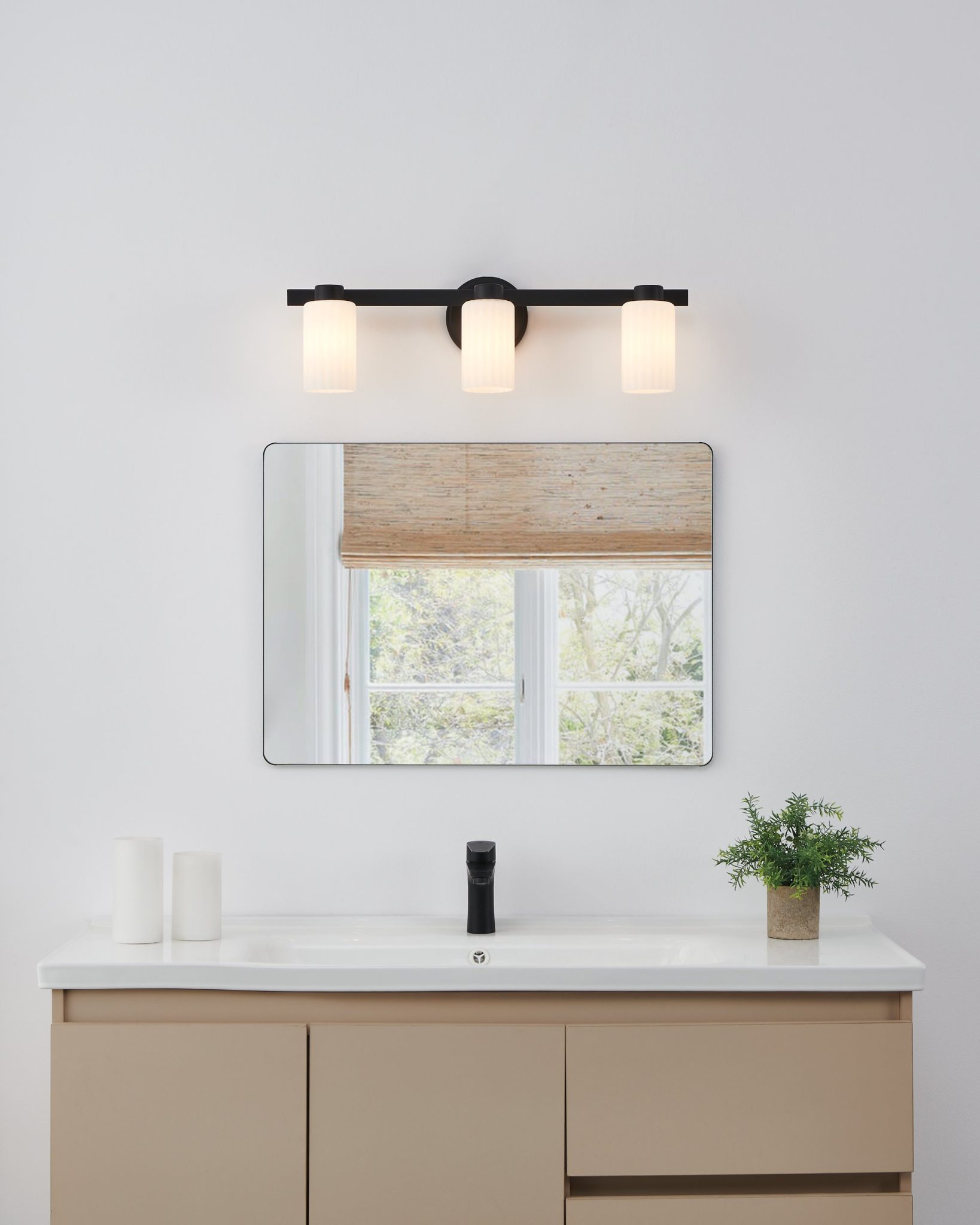La murale de salle de bain Bedminster équilibre élégance classique et modernité. Son cadre en noir mat soutient trois abat-jours en verre opale nervuré, dont les surfaces gravées diffusent une lumière chaude et uniforme. Avec ses lignes épurées et sa texture délicate, elle apporte une sophistication discrète aussi bien aux intérieurs traditionnels que contemporains.