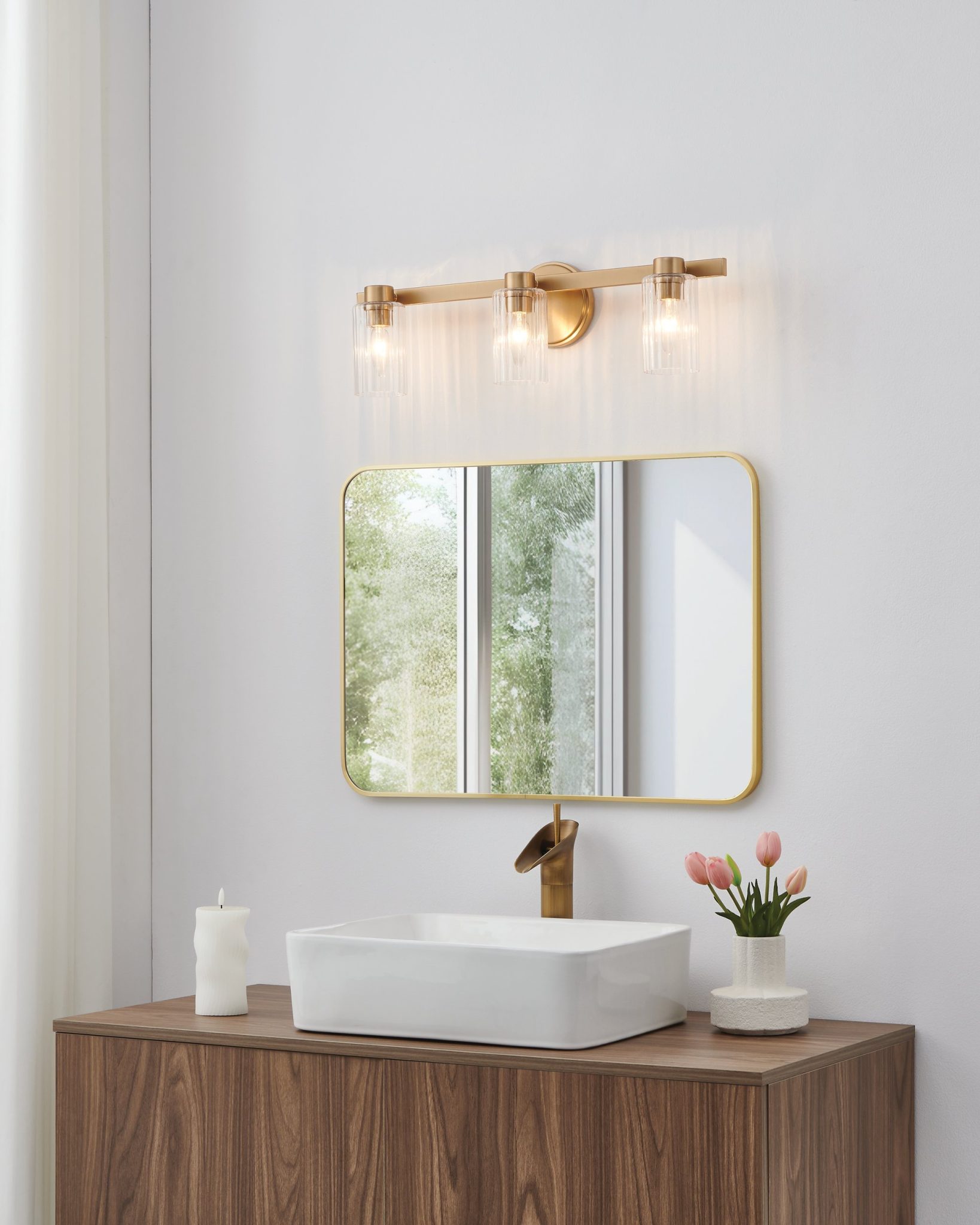 La murale de salle de bain Bedminster exprime un style intemporel avec sa finition en or champagne et ses abat-jours en verre clair nervuré. Trois cylindres élégants révèlent le dialogue subtil entre lumière et texture, projetant une lueur nette mais chaleureuse. Entre tonalités métalliques riches et lignes épurées, elle met en valeur autant les intérieurs classiques que modernes.