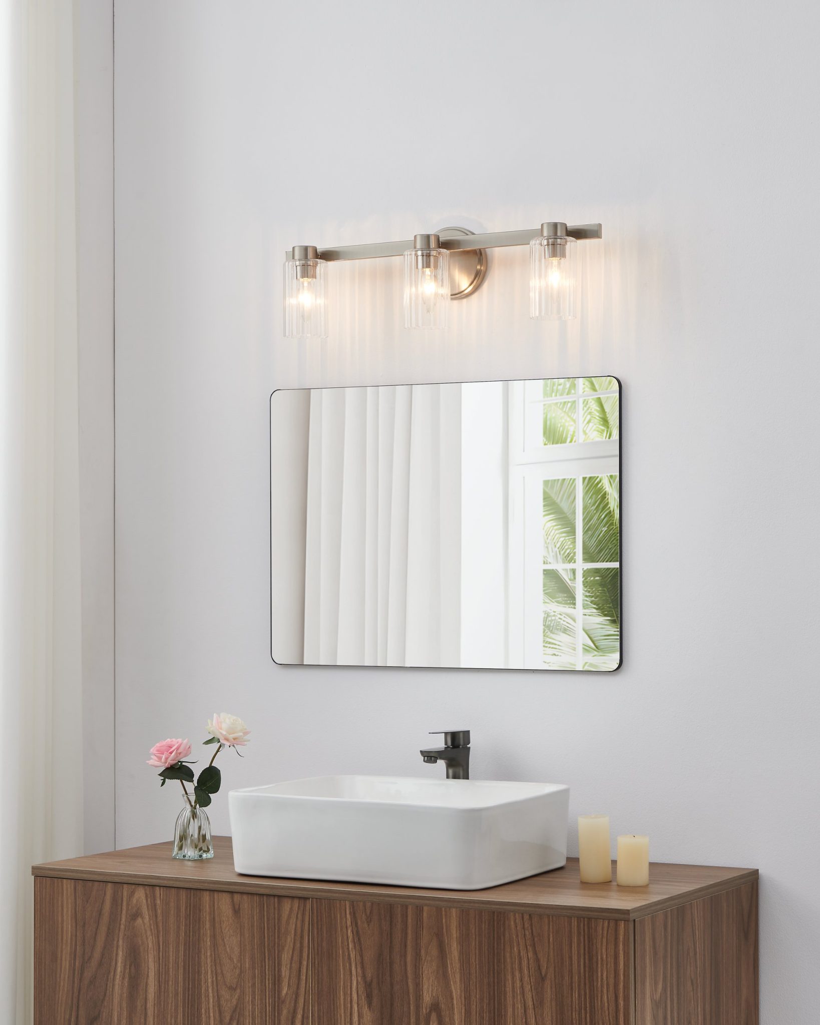 Découvrez Bedminster murale de salle de bain 24 po à 3 lumières nickel brossé avec abat-jours en verre clair nervuré