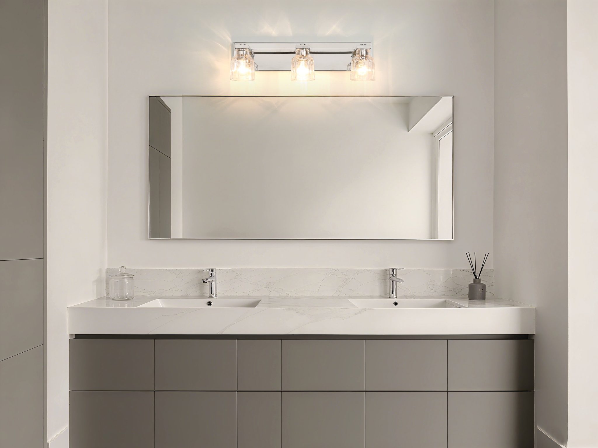 La collection de luminaires de salle de bain Dryden séduit par son équilibre parfait entre force et élégance. les abat-jourss en verre facetté et épais créent une subtile impression de mouvement, transformant la lumière en une déclaration de style raffinée. Fixée sur une plaque arrière complète, cette collection dégage un style intemporel, défini par son caractère confiant et distinctif.