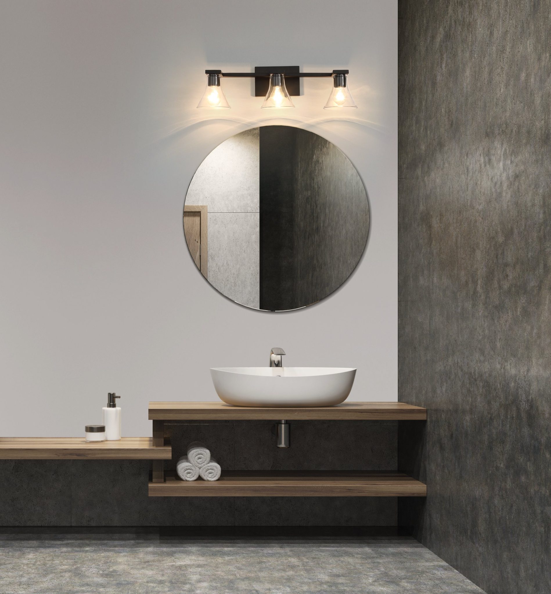 Découvrez Gilford murale de salle de bain 24 po à 3 lumières noir mat avec abat-jours en verre clair