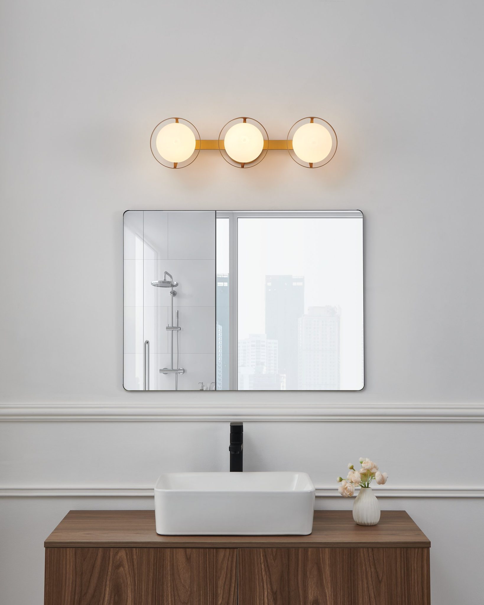 Découvrez Parker murale de salle de bain 24 po à 3 lumières or champagne avec abat-jours en verre opale gravé
