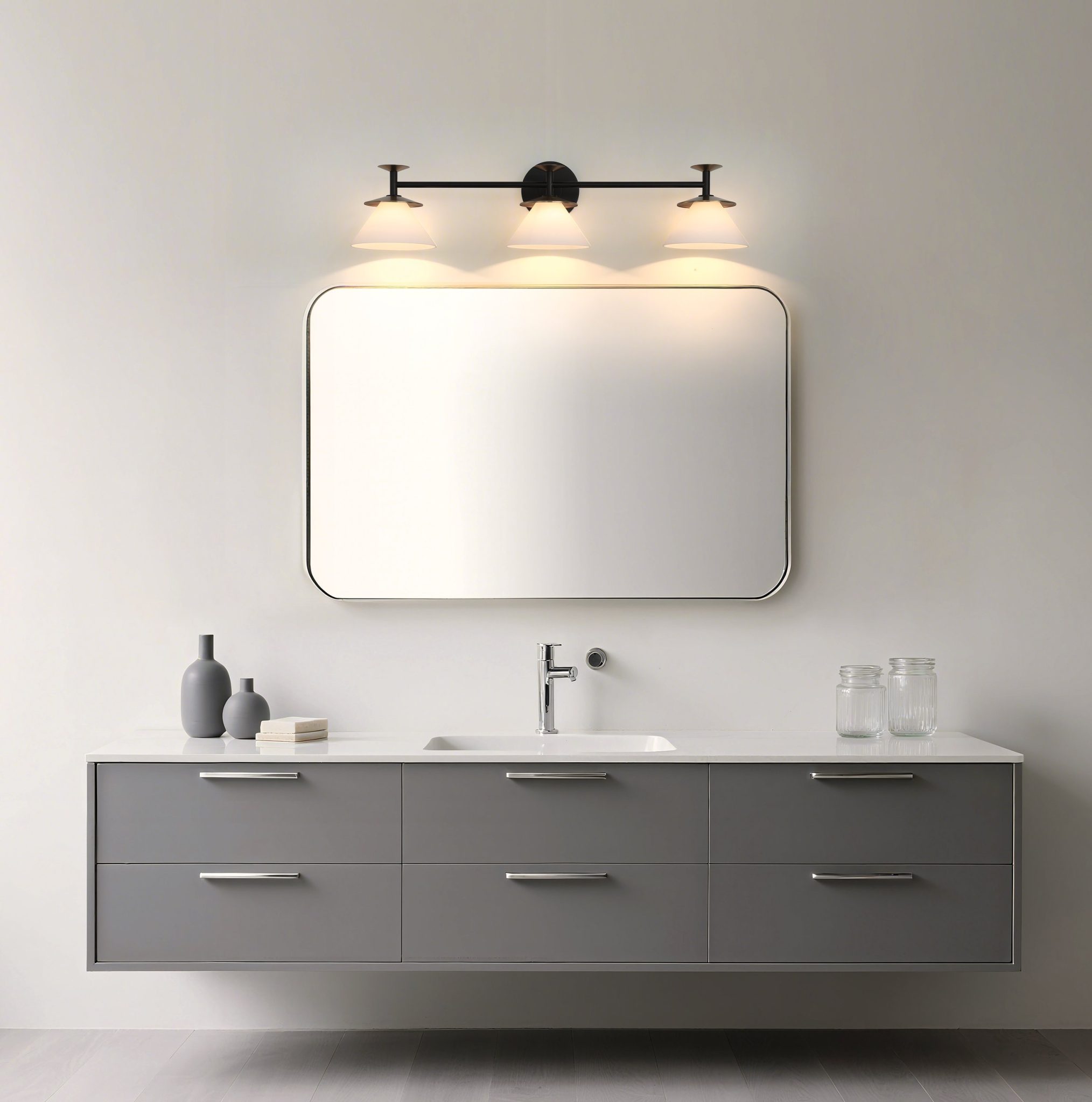La murale de salle de bain Tremolo apporte une nouvelle dimension à l’inspiration du milieu du siècle dernier grâce à sa géométrie précise et à ses abat-jours coniques doucement évasés en verre opale gravé. Sa finition noire mate jumelée à des accents en or champagne enrichit la pièce d’une note chaleureuse, tandis que chaque abat-jour repose dans une coupelle inclinée agrémentée de disques métalliques interchangeables pour un effet sur mesure. Tremolo saisit l’essence du style moderne luxueux en équilibrant formes audacieuses et chaleur raffinée.