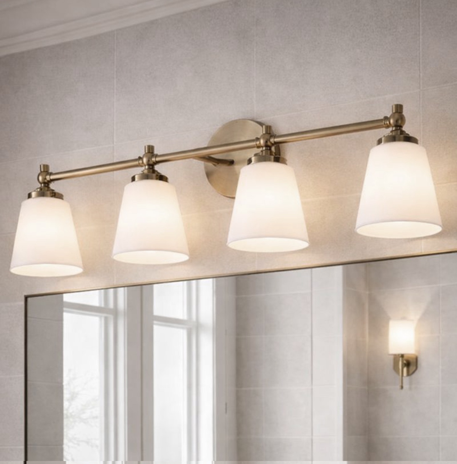L’applique murale SOLARA à 4 lumières pour salle de bain allie un glamour moderne à des accents maximalistes, mêlant luxe raffiné et fonctionnalité au quotidien. Sa finition or chaud évoque les métaux Art déco et la richesse baroque, tandis que ses trois abat-jour plats en verre opale diffusent une lumière douce et sculpturale, créant un équilibre harmonieux. Avec ses 78 cm de large, cette applique est parfaitement dimensionnée pour les vasques simples ou doubles, offrant un éclairage flatteur et uniforme, à la fois pratique et raffiné. Conçue pour quatre ampoules de 60 W de type A, elle diffuse une lumière douce et chaleureuse qui sublime les gestes du quotidien d’une touche d’élégance intemporelle. Résistante à l’humidité et équipée du système d’installation Easy Connect, SOLARA est une pièce maîtresse qui apporte une géométrie raffinée, une richesse culturelle et une grandeur discrète aux intérieurs modernes et de style transitionnel.