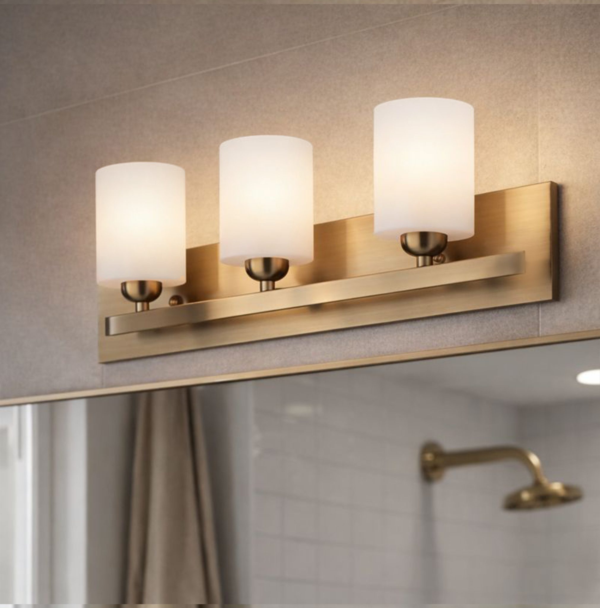 L’applique murale HAMPTON à trois lumières apporte une touche à la fois moderne et intemporelle à votre salle de bain ou salle d’eau. Avec sa finition dorée élégante et ses trois abat-jour cylindriques en verre albâtre, cette applique offre style et une lumière douce et diffuse. Mesurant 61 cm de large, elle est parfaitement dimensionnée pour une installation au-dessus d’un miroir, qu’il s’agisse d’un meuble-lavabo simple ou double, ce qui en fait un luminaire idéal pour votre salle de bain. Conçue pour trois ampoules de 60 W de type A19, elle diffuse une lumière chaude et uniforme, à la fois fonctionnelle et flatteuse. Cette applique polyvalente peut être installée avec les abat-jour orientés vers le haut ou vers le bas, selon vos préférences. Grâce à son système Easy Connect, l’installation est rapide et facile. L’applique HAMPTON allie finitions luxueuses, praticité au quotidien et simplicité d’installation, s’intégrant parfaitement aux intérieurs modernes et classiques.