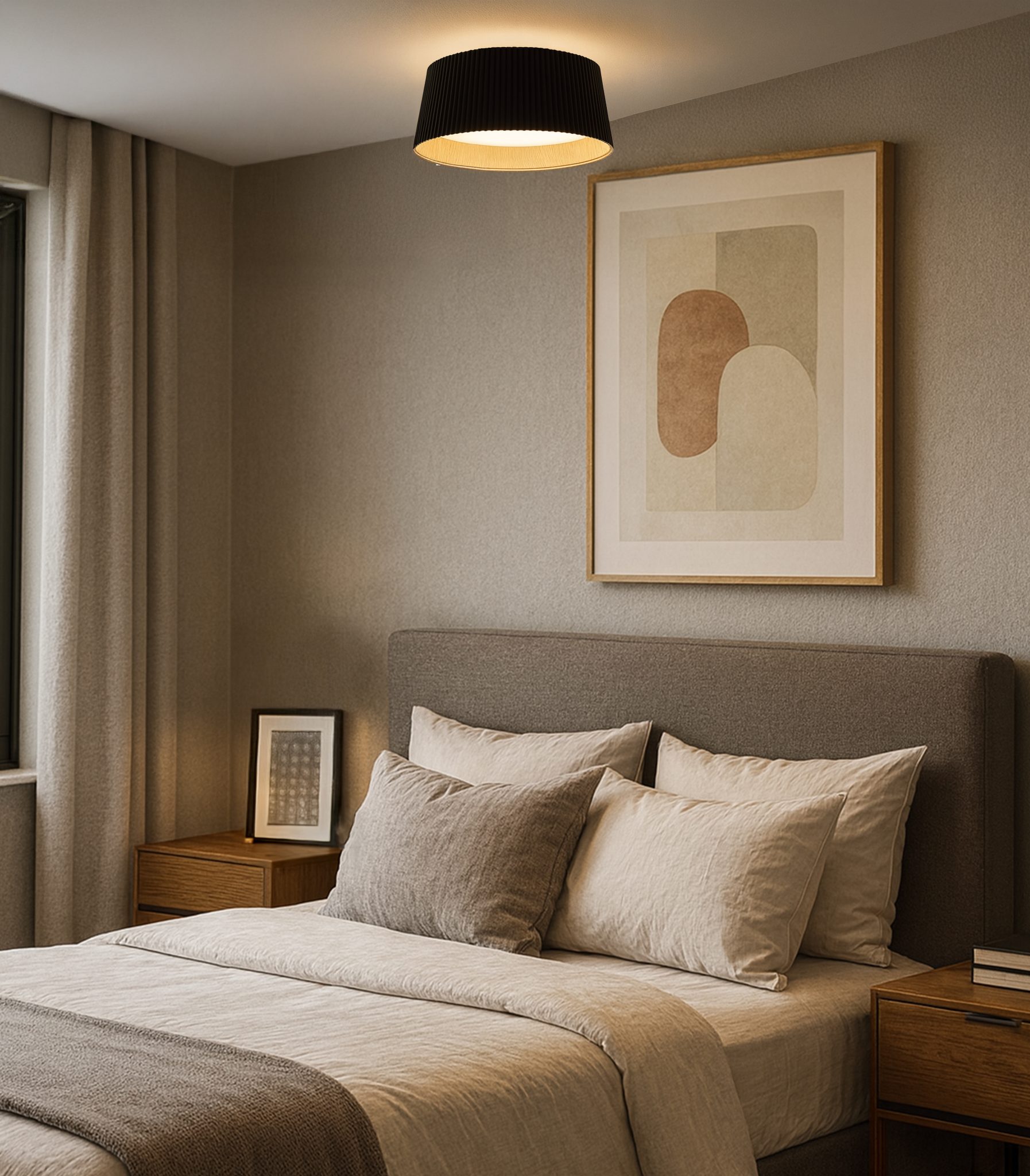 Le plafonnier LED MIRA de 45 cm (17,75 pouces) allie un design contemporain à des détails inspirés de la nature, créant ainsi une ambiance à la fois saisissante et apaisante. Son abat-jour en métal noir mat nervuré présente une finition intérieure en bois hydrographiée, évoquant les textures naturelles et diffusant une lumière chaude et accueillante. Un diffuseur en acrylique adoucit la lumière, tandis que la LED intégrée de 32 W offre un éclairage écoénergétique de 2 000 lumens avec trois températures de couleur CCT sélectionnables (3 000 K, 4 000 K, 5 000 K). Gradable et doté d’une technologie LED innovante, le MIRA allie performance et ambiance, ce qui en fait un choix idéal pour les chambres, les salons ou les entrées.