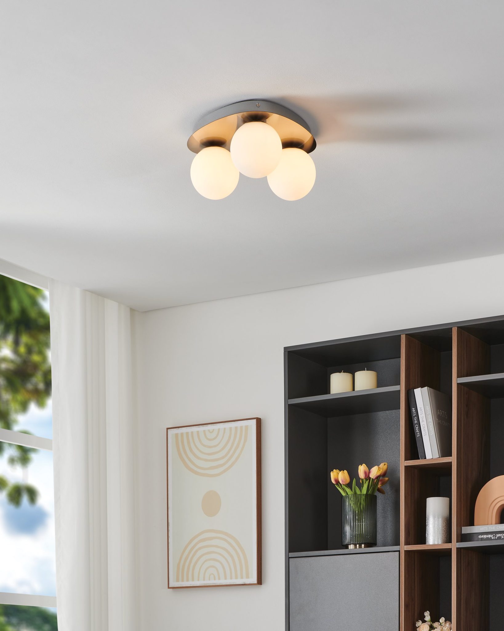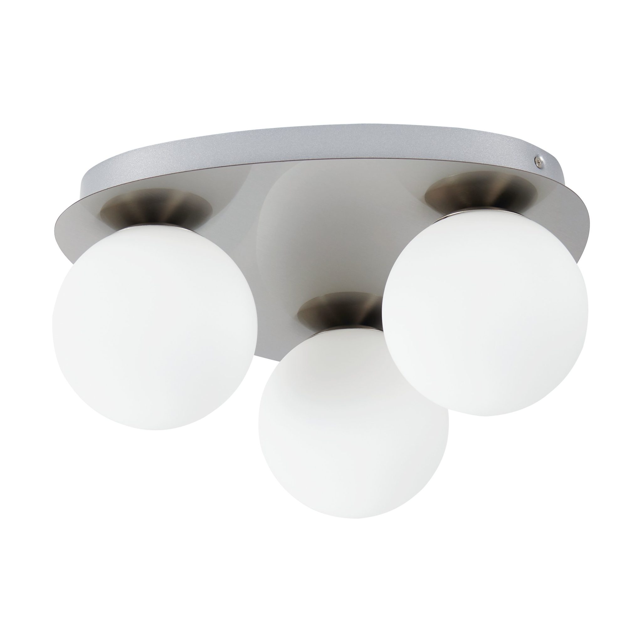 Découvrez le Castrovido plafonnier 12 po à 3 lumières nickel brossé avec abat-jours en verre blanc
