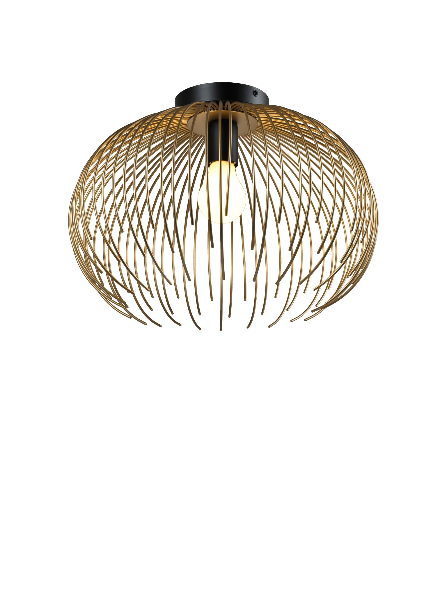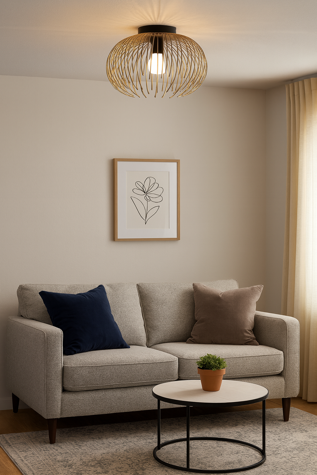 Ce plafonnier à abat-jour, composé de tiges métalliques cintrées, crée une présence artistique tout en restant léger visuellement. La lumière se diffuse à 360°, projetant de subtils jeux d’ombres qui réchauffent l’ambiance. Parfait pour une entrée, un passage, une chambre ou un salon, il signe un décor moderne et élégant sans encombrer l’espace.