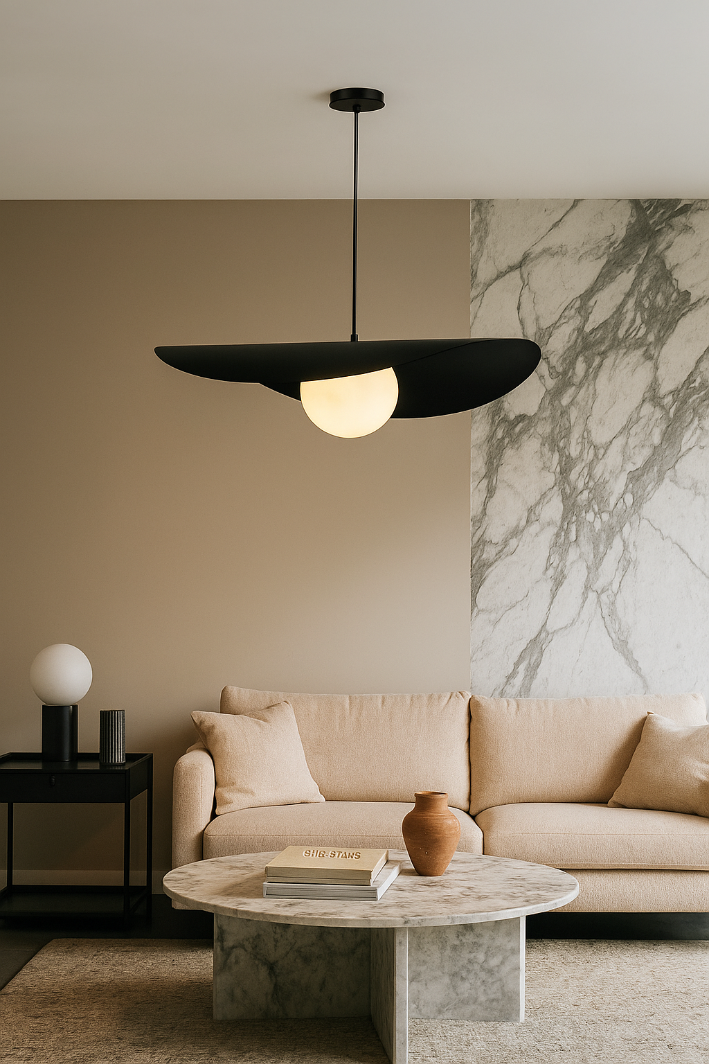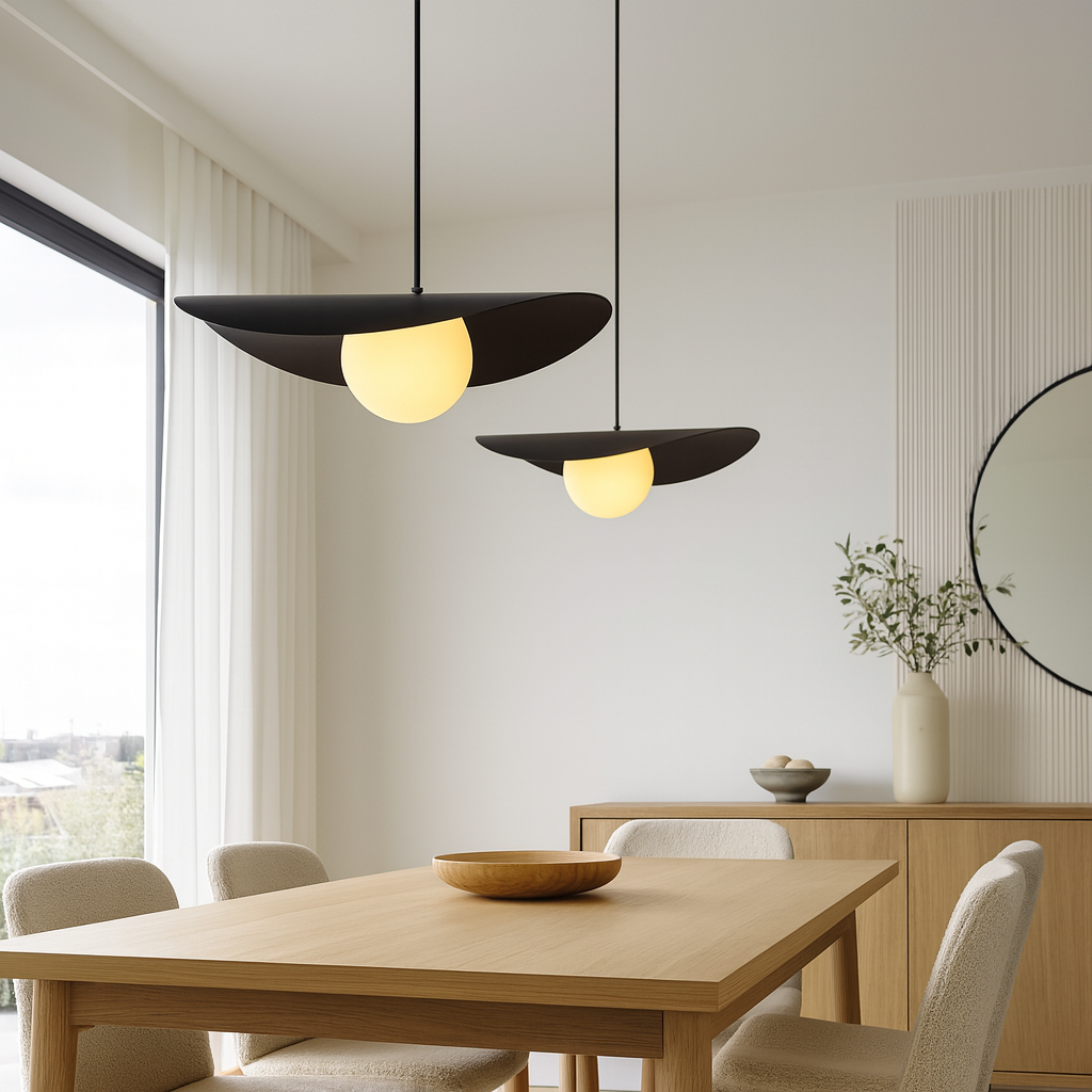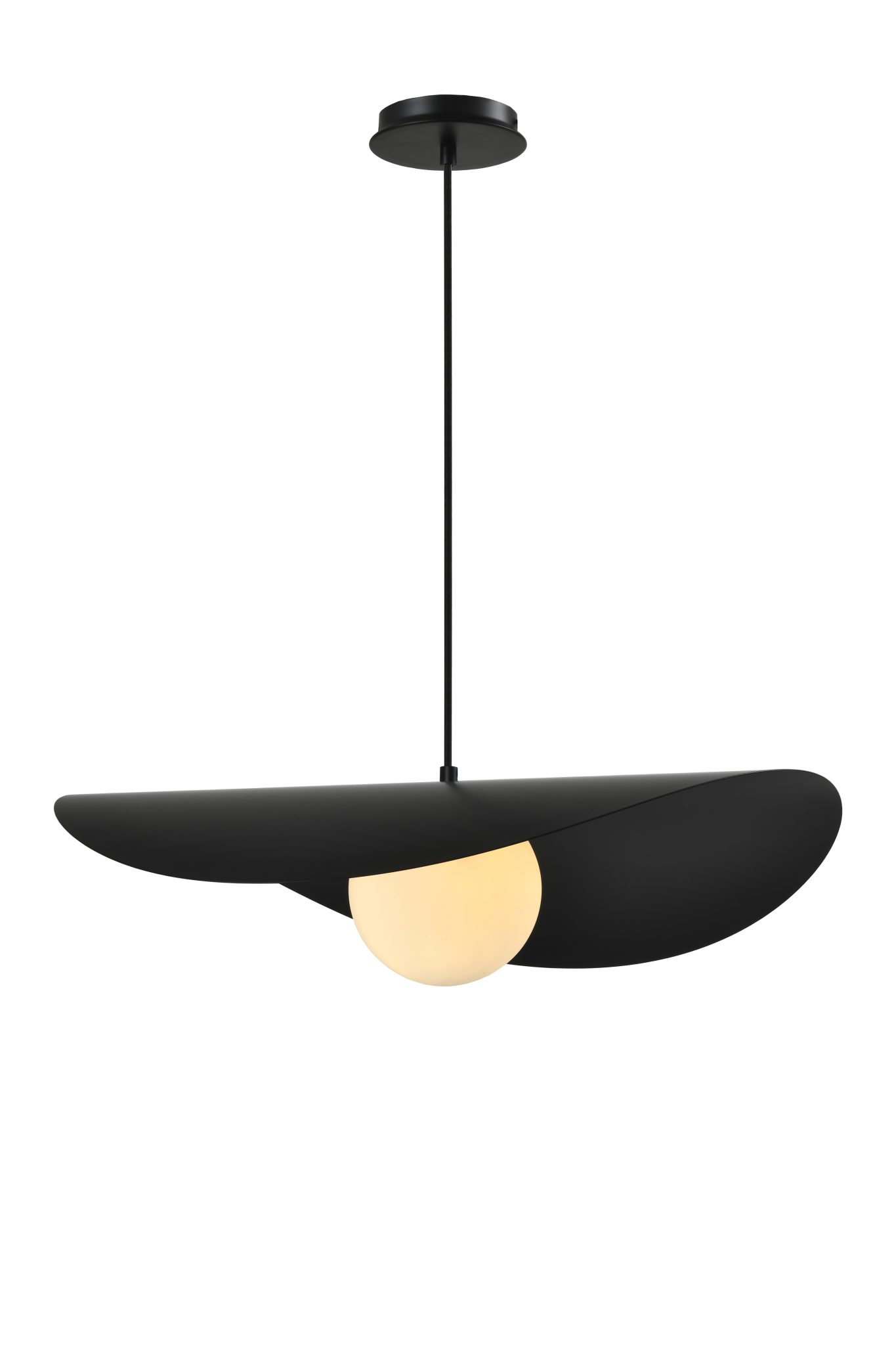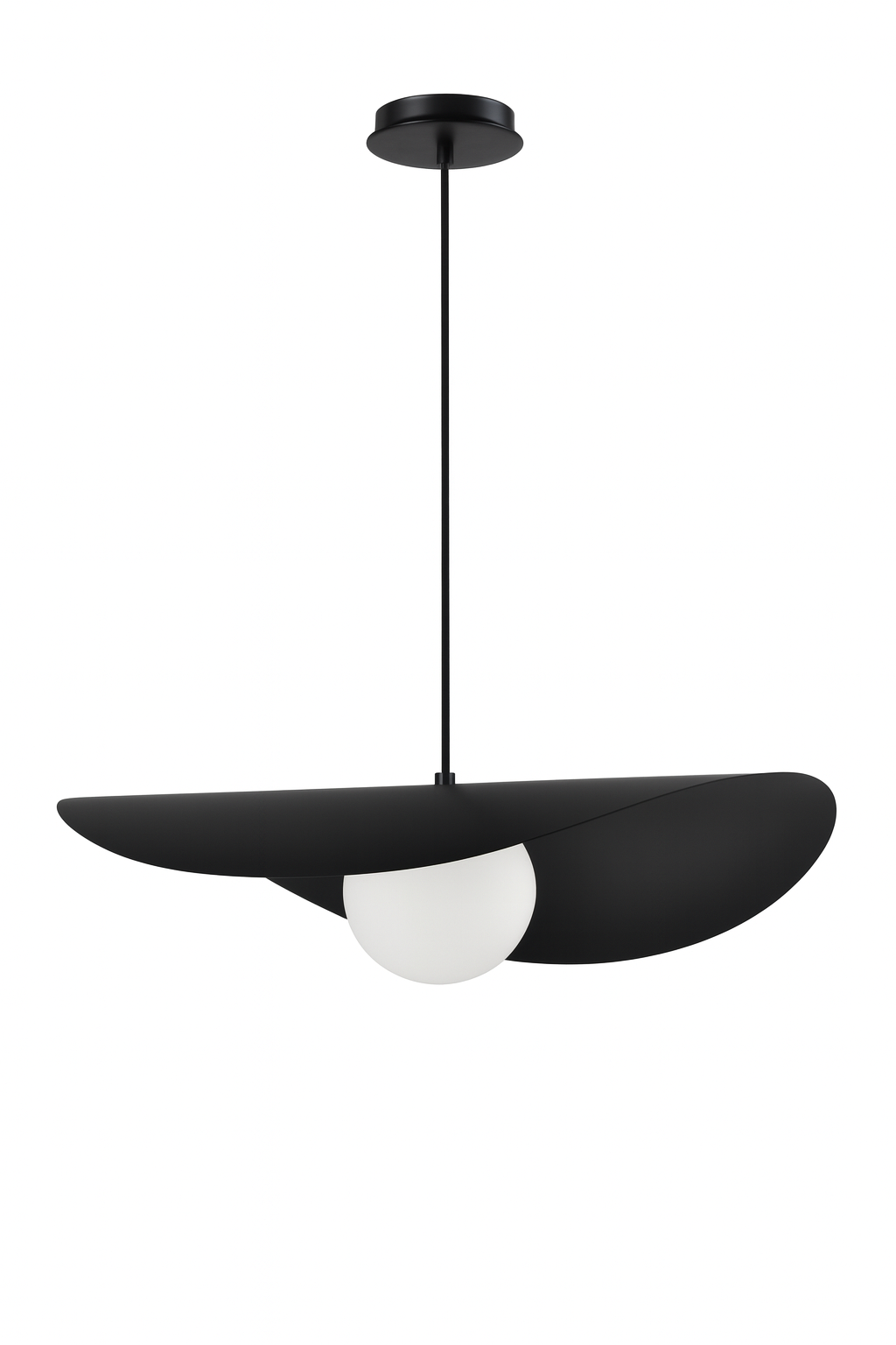 Son disque asymétrique crée un jeu d’ombre et de lumière tout en dissimulant délicatement la source lumineuse, alors que le globe assure un éclairage homogène et sans éblouissement. Épurée mais expressive, cette suspension s’intègre aussi bien aux décors modernes qu’aux intérieurs scandinaves ou contemporains. Parfaite au-dessus d’une table à manger, d’un îlot, dans une cage d’escalier ou en pièce maîtresse du salon.