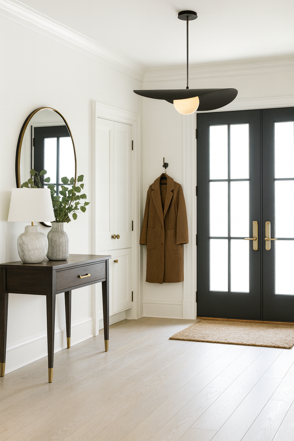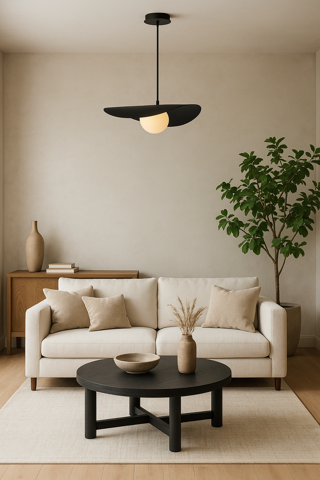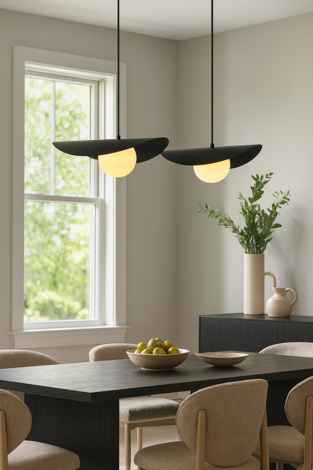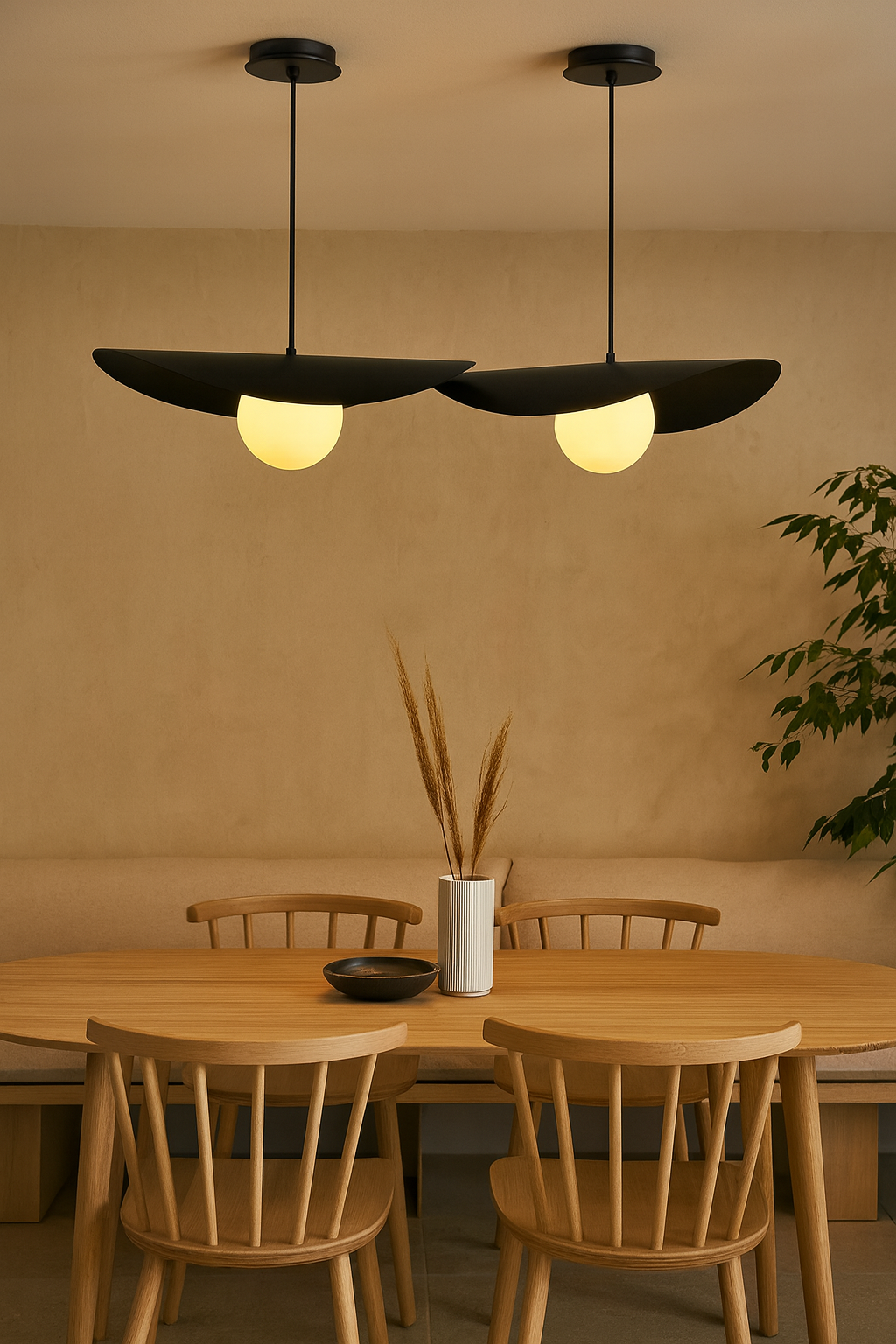 Son disque asymétrique crée un jeu d’ombre et de lumière tout en dissimulant délicatement la source lumineuse, alors que le globe assure un éclairage homogène et sans éblouissement. Épurée mais expressive, cette suspension s’intègre aussi bien aux décors modernes qu’aux intérieurs scandinaves ou contemporains. Parfaite au-dessus d’une table à manger, d’un îlot, dans une cage d’escalier ou en pièce maîtresse du salon.