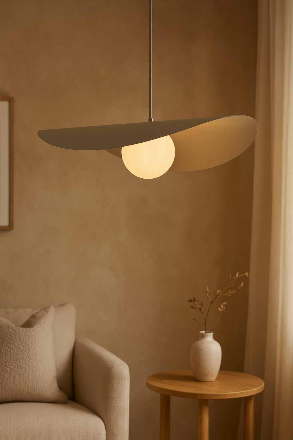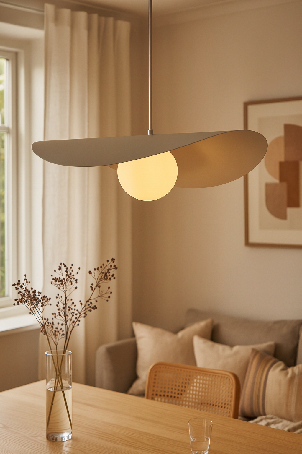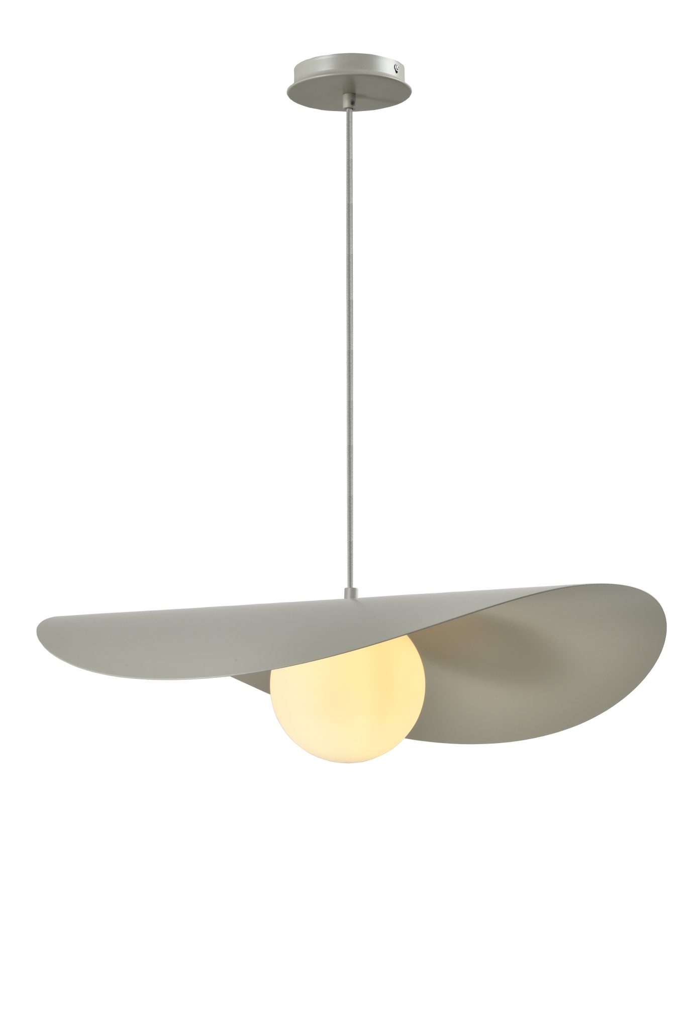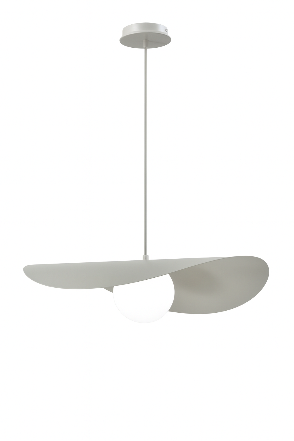 Son disque asymétrique crée un jeu d’ombre et de lumière tout en dissimulant délicatement la source lumineuse, alors que le globe assure un éclairage homogène et sans éblouissement. Épurée mais expressive, cette suspension s’intègre aussi bien aux décors modernes qu’aux intérieurs scandinaves ou contemporains. Parfaite au-dessus d’une table à manger, d’un îlot, dans une cage d’escalier ou en pièce maîtresse du salon.